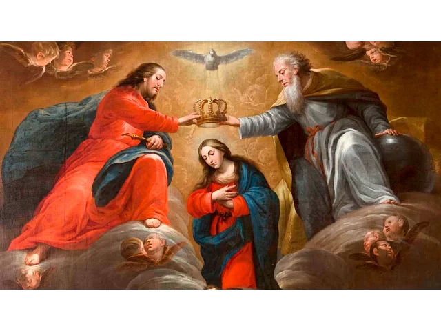também um apocalipse de são joão aparece a rainha mãe o capítulo 12 do apocalipse diz assim que no céu apareceu um grande sinal uma mulher vestida com o sol e tendo a lua debaixo dos pés sobre a cabeça uma coroa de doze estrelas e sem dúvida algum a rainha mãe existe uma certa polêmica de interpretação com relação a essa passagem do apocalipse porque é evidente os evangélicos/protestantes não aceitam que aqui nós estejamos falando de maria eles interpretam dizendo não é o povo de israel do antigo testamento olha a cor ou duas estrelas são as 12