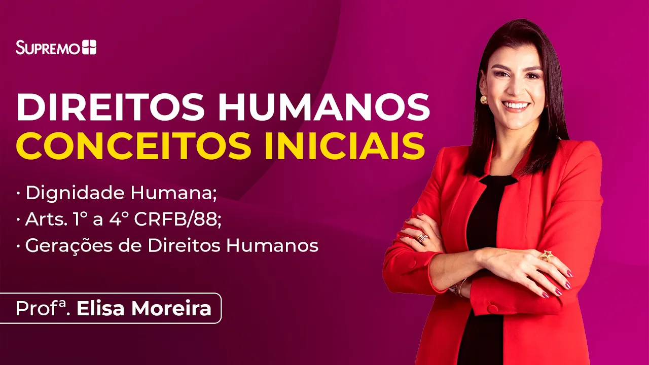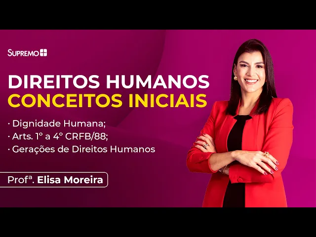 E aí [Música] E aí o Olá sejam muito bem-vindos e bem-vindas ao nosso curso de direitos humanos eu sou a professora Elisa Moreira sou delegado de polícia em Minas Gerais há quase 13 anos e professora da disciplina o meu objetivo é fazer com que você acerte todas as questões da prova que você enfrentará o nosso curso passaremos por conceitos iniciais que traduzem a aula de hoje nós vamos conversar sobre a dignidade da pessoa humana as características dos Direitos Humanos falaremos sobre as gerações desses direitos e claro artigos 1º 2º 3º e 4º da constituição que