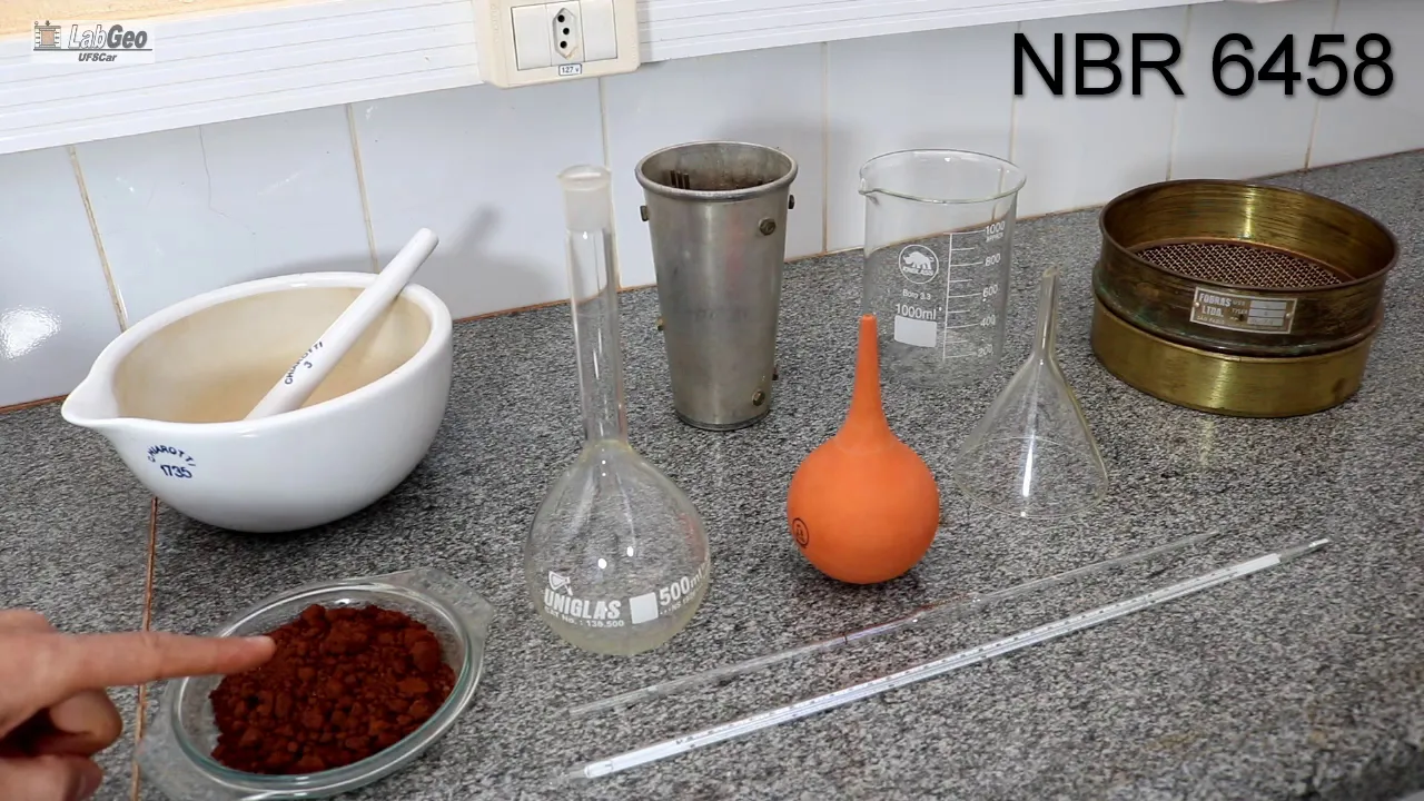 picnômetro inicia-se a preparação do solo para o ensaio despeja-se uma quantidade da amostra não mofaris e com ajuda da mão de grau e se tornou a se o solo e deve ser destorroar material até se obter uma massa homogênea e a seguir monta-se a peneira de malha 4.8 MM sobre o fundo metálico é penera se o solo E aí E aí e em seguida separa-se aproximadamente 50 G da amostra de solo que passou pela peneira 4.8 MM a e o solo então levado ao béquer e submerso em água destilada e o béquer E então tampado