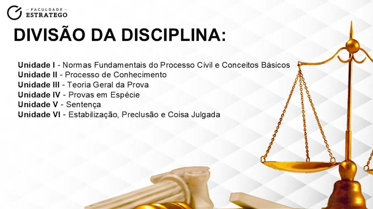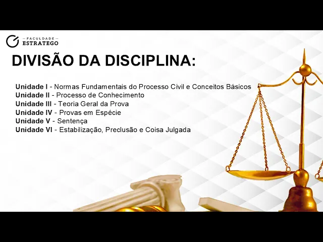 Na primeira unidade, vamos entender os conceitos fundamentais e também as principais normas que envolvem essa disciplina, fazendo também uma retomada do conteúdo que vocês aprenderam em TGP. Tudo bem? Avançando disso, na nossa segunda unidade, vamos estudar o processo do conhecimento em si: quais são suas etapas, quais são seus requisitos e suas características.