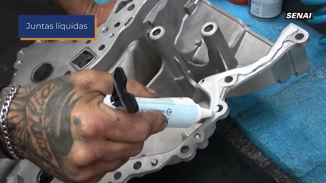 ou travas químicas tem como base ingredientes como silicone vamac e flua sendo que a vedação ocorre por adesão durante a instalação da bomba de óleo tem a tensão especial ao posicionamento das juntas sólida a fim de garantir o posicionamento correto e evitar vazamentos de fluídos e gases no caso da junta líquida a aplicação deve ser feita com cuidado utilizando uma camada com filete de no máximo 1,3 MM de espessura na área de contato com o bloco assim na instalação da bomba de óleo Você precisará realizar as seguintes ações ali o virabrequim para facilitar o encaixe