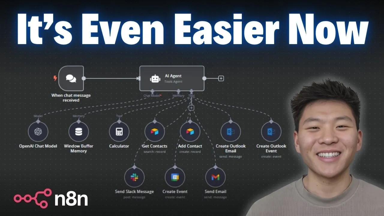 nnn has done it again they've somehow found a way to make building AI agents even easier so whether you've been building agents for a while now or this is going to be your first time taking a stab at it what we're going to look at today is how you can get one spun up in minutes and completely understand what's going on and start to add more tools and more functionality super easily so don't want to waste any time here we're already in nadn I'm going to hit tab type in AI agent and we're going to grab one and bring it into our workflow so the first thing to recognize is that we're chatting with our agent in nadn that's why there's a chat trigger right here and if we click on this red chat P at the bottom we can see this is where we actually talk to the agent next what we want to do is add a brain for the agent so I'm going to click on the chat model the plus button right here click on open AI chat model and I've already got my credentials connected so I'm good to go with chat gbt 40 mini as the brain for our agent and so now we're already able to talk to it I can come in here and I can say hello and it will respond hey how's it going today and then we'll just quickly take a look at what actually goes on in the agent all we're getting is the prompt user message so every time that we talk to the agent down here in this little window the agent right here as you can see because we're searching for a prompt within the connected chat trigger node this is what it's getting which is we just said hello and then we can see on the right the output which is what it said back to us was hello how can I assist you today now that we have our agent up and running all we have to do is add tools and this is where it gets super super easy so I'm going to click on the plus under tool and then on the right we have all these nodes as tool options and I made a video about this a week or so ago talking about how easy it is to connect these things using the from AI function but what I'm going to show you guys today is even easier than using from AI so when you think of an AI agent and you start to think about functionality the first thing you may think of is being able to send emails so I'm going to grab a Gmail tool right here if I can type it correctly we're going to grab Gmail and then we can see what we're going to do is set up our Resource as a message and we're going to be sending a message by the way if this is your first time you're going to have to connect your Gmail using a credential um I'll tag a video right up here where I talk about how to do that anyways when you want to send an email you have to basically fill out three things who's this going to what's going to be the subject and then what is going to be the actual body content message of the email also the email type which we're going to change in this case from HTML to text and anyways in that previous video when I talked about from AI we'd have to go into the two parameter click on expression type in two curly braces grab from Ai and then we'd have to define a key and then we'd have to describe that key so that the model knows what it's looking for to fill in this parameter and if that doesn't make sense to you yet don't worry it will but I'm just going to keep breaking this down real quick so now we don't have to do from AI anymore we can simply just click on this button over here that says let the model Define this parameter so all I have to do is click on this button click on this button and click on this button and now when we're talking to the agent it's going to use its brain it's a large language model to understand who to send it to what to make the subject and then what to fill in as the message you can see that we also have the ability to add a description to one of these Keys which I'll show an example of later but this just says explaining to the llm how it should generate this value a good specific description allows the llm to produce expected results much more often anyways I just changed the name of this node to send email so that the agent understands what it does and what I'm going to show you guys that we have no system message in here typically the system message is like the instructions for the agent and in this case all we saying is the default you're a helpful assistant and the reason I'm not changing this is just to show you guys how intelligent these agents are when you start to add tools like I said this took me a minute and it's already going to be able to send emails for us intelligently so let's get in here and try out a prompt so as you can see I said send an email to Nate herk asking him if he wants to go to a baseball game this weekend we'll send that off we'll see the agent think about it using its brain and now it's already sent that email before I could even finish reading that off so it said the email has been sent to Nate asking if he wants to go to a baseball game this weekend we can click into this node to understand what just happened so because I told you guys that it's using its brain to figure out the two the subject and the message you can see in the top left it filled out these parameters with the email with the subject and then also with an actual body message so let's hop into Gmail and take a look at this so here's the email we can see the subject is baseball game this weekend and the message says hey Nate hope you're doing well I was wondering if you want to go to a baseball game this weekend let me know if you're interested best your name so obviously we don't want the email to be signing off like this every time and we want to also get rid of this automatic message so back in Ed end all I'm going to do is add a description to this message field and I'm going to say sign off emails as Nate from ABC Corp so that should take care of the actual sign off and then I'm going to add an option down here click on append nadn attribution and then flick this off now all I'm going to do is come down here to