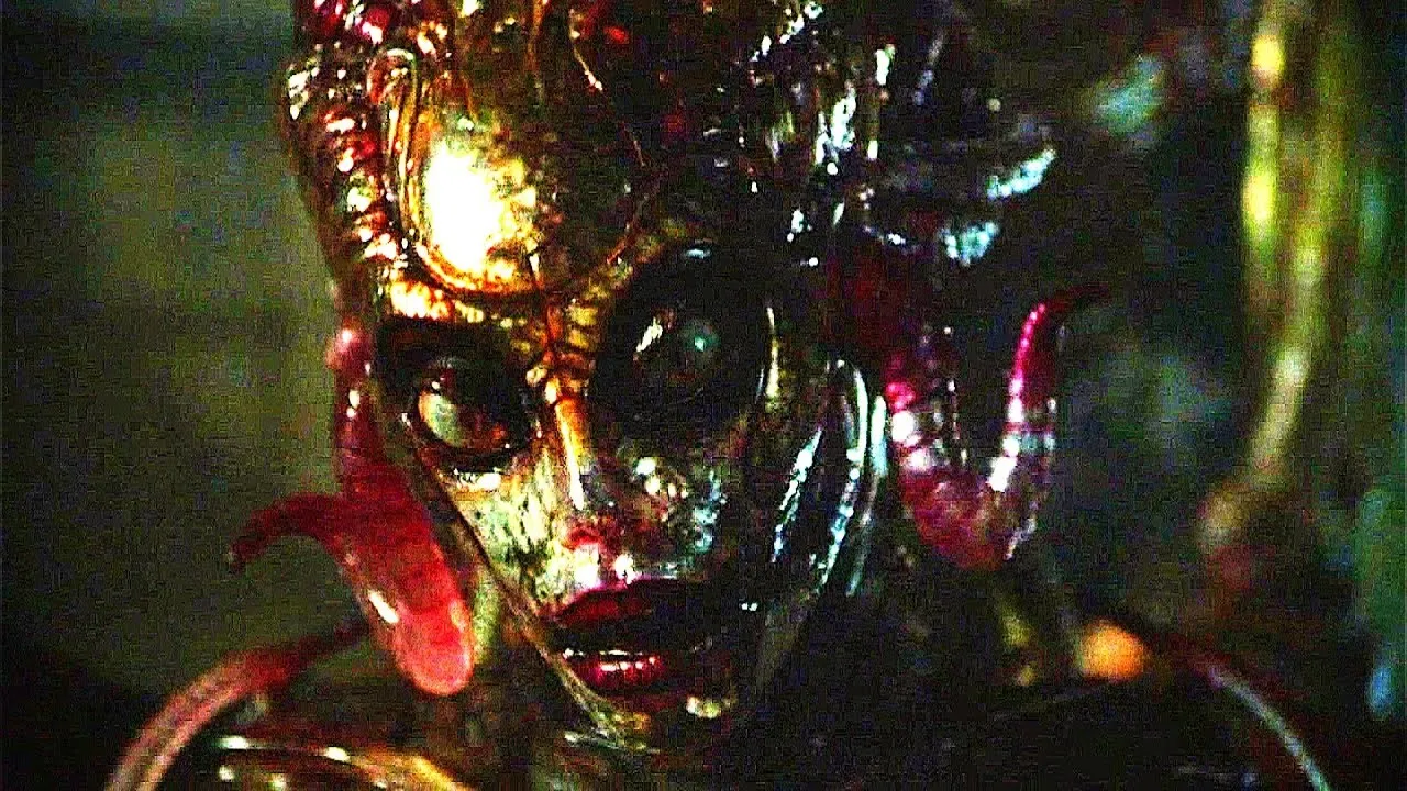 Suddenly, a tentacle shoots out of the cocoon and hooks onto the conductor's neck. Not long, Sil emerges as a full-grown female. She steps over the conductor's lifeless body as she leaves the bathroom.