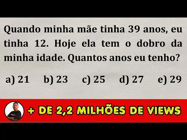 Olá pessoal hoje eu trago para vocês o problema de concurso muito legal envolvendo equação do primeiro grau que envolve idade né vou mostrar para vocês duas formas diferentes a gente resolver esse problema primeira forma algébrica montando a equação para resolver o problema e depois usando a lógica mas eu queria que vocês tentasse resolver sozinhos primeiro apertem a pause tentem resolver depois deixe nos comentários a resposta de vocês eu vou mostrar as duas soluções passo a passo agora vem comigo aqui ó problema diz o seguinte quando minha mãe tinha 39 anos eu tinha 12 hoje ela