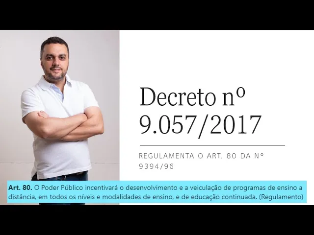 E aí Olá pessoal tudo bem eu sou o Gustavo e hoje vamos para mais uma aula sobre a questão de legislação para concursos espero ajudar você qualquer dúvida deixe seu comentário em baixo as descrições esse vídeo estarão os outros relativos à a LDB ao plano nacional de educação a lei de Regimento o trabalho do segundo Federal 8112 e as outras que eu também postei no canal tá se inscreva-se compartilhe e bom gostoso como lá então e aqui ó estamos hoje no decreto nº 9.057 da lei que foi que regulamenta o artigo 80 da LDB Lembrando