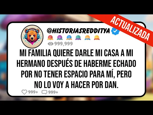 Mi familia quiere darle mi casa a mi hermano después de haberme echado Por no tener espacio para m pero no lo voy a hacer por dan advierto A todos aquí que Esto va a ser muy largo tan largo que lo dividiré en dos publicaciones e incluiré un resumen para cada una realmente no me importa quien crea esto es tan loco que no culpo a nadie que lo considere falso no discutiré al respecto Pero esto me sucedió tampoco me importa si alguien de Mi familia ve esto no voy a endulzar nada pero tampoco revelaré detalles que