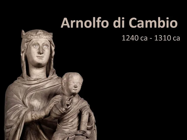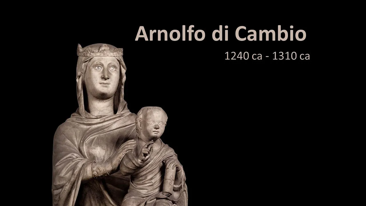 arnolfo di cambio si forma presso la bottega di nicola pisano nel quale segue lo stile classicheggiante ma con un tono di maggiore sobrietà ponendo attenzione al dato realistico e alla composizione semplice ottenuta tramite volumi compatti la sua attività si svolge prevalentemente tra la toscana l'umbria e il lazio nel 1270 è chiamato a roma dal re di sicilia carlo primo d'angiò per il quale realizza una statua del sovrano per la chiesa di santa maria in ara coeli il re è seduto col busto eretto su un seggio privo di schienale de corato nei fianchi da teste e