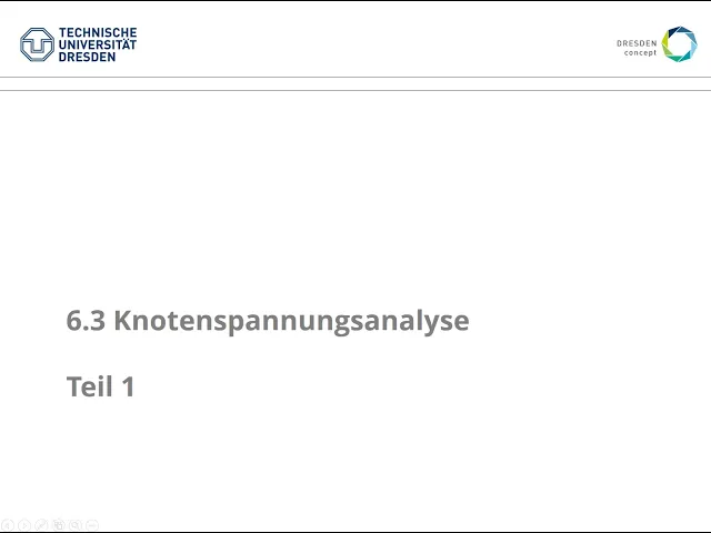 ja herzlich willkommen zum Kapitel 6. 3 das trägt den Titel knotenspannungsanalyse und die knotenspannungsanalyse ist eines der wichtigsten Verfahren der Elektrotechnik zu Analyse von Schaltungen und die knotenspannungsanalyse bildet unter anderem die Grundlage der computergestützten Analyse Software Spice und deswegen werden wir hier also auch diese umfangreiche Kapitel diesen Verfahren widmen und bevor wir so richtig loslegen müssen wir am Anfang ein paar Begrifflichkeiten noch einmal einführen wir brauchen den Begriff des bezugsknotens und ein bezugsknoten ist ein Knoten im Netzwerk der erst einmal willkürlich gewählt werden kann wie es hier steht es bietet sich aber an einen Knoten zu wählen der mit möglichst vielen Zweigen verbunden ist das verringert später dann den Rechenaufwand und ein Knoten der eine Regel mit sehr vielen Zweigen verbunden ist ist der massek deswegen werden wir jetzt auch in den zukünftigen Beispielen die wir diskutieren als bezugsknoten in der Regel die Masse wählen der zweite Begriff den wir klären müssen ist was ist eigentlich eine knotenspannung und da bekommt er das Verfahren seinen Namen eine knotenspannung ist die Spannung zwischen einem beliebigen Knoten im Netzwerk und dem bezugsknoten da schauen wir uns das hier mal an Beispiel an in dieser Skizze die sehen hier so einen netzwerkzweig und schraffiert sei jetzt einfach ein beliebiger zweipol der diesen netzwerkzeug beschreibt und die Knoten sind hier mit M und N entsprechend bezeichnet der bezugsknoten wird in der Regel mit 0 bezeichnet und die knotenspannungen sind jetzt also die Spannungen also die Potenzial Differenzen zwischen dem jeweiligen Knoten also m oder n und dem bezugsknoten und hinsichtlich der Bezeichnung der Knoten Spannungen verwenden wir jetzt also die Konvention um 0 ist jetzt also die minutenspannung gerichtet vom Knoten m zum bezugsknoten 0 und das Schöne ist wenn wir die knotenspannungen im Netzwerk kennen können wir alle weiteren zweigspannungen durch diese knotenspannungen ausdrücken in diesem Fall also die zweigspannung UN also das Spannungsabfall vom Knoten m zum Knoten n lässt sich jetzt durch die knotenspannungen wie folgt ausdrücken naja bilden sie hier gedanklich mal eine Masche das haben wir aus diesen drei Spannungen besteht ein geschlossenen Umlauf dann ist also die zweitspannung umn die Differenz der Knoten Spannungen un 0 - u null und diese knotenspannungen werden wir jetzt also zunächst einmal für das Beispiel aus dem Kapitel 6. 2 einführen das heißt wir werden jetzt ja auch bei der knotenspannung ist Analyse wieder das Beispiel aus Kapitel 6.