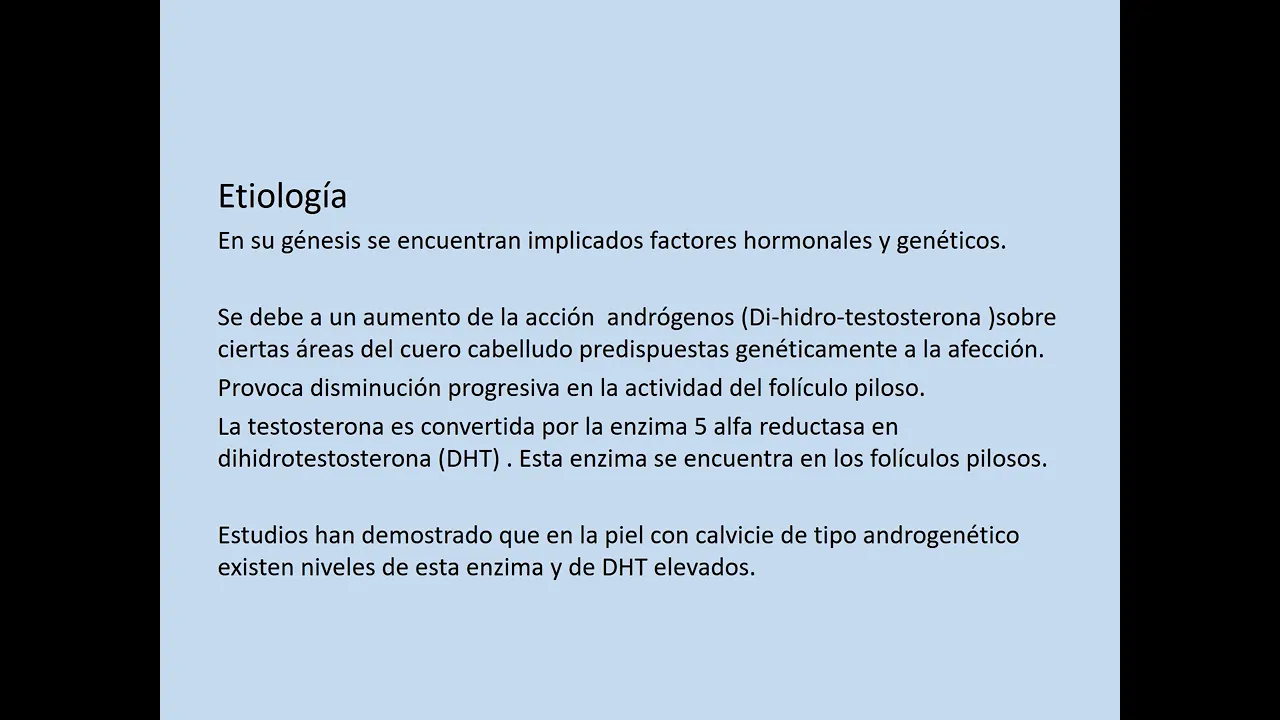 se define como una pérdida de cabello con un patrón definido se puede dar tanto en hombres como en mujeres Aunque debemos recalcar que es muchísimo más frecuente en los varones es la causa más frecuente de alopecia y dentro de su Génesis o causas se encuentran descriptos factores tanto hormonales como genéticos dentro de los factores genéticos podemos expresar la alteración en la función del receptor para andrógenos en este caso el Gen que codifica para este receptor está ubicado en el cromosoma X Pero por otro lado también están involucrados genes que están ubicados en autosomas esto justifica