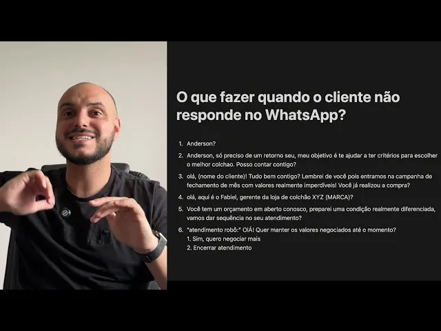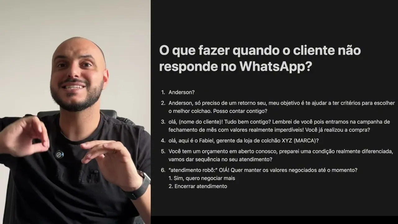 seja bem-vindo no vídeo de hoje eu vou te mostrar o que que você tem que fazer quando o cliente não responde você lá no WhatsApp sabe quando você tá conversando o cliente simplesmente some desaparece pois bem eu vou te mostrar como se comportar uma linha de raciocínio lógica por trás de um comportamento que vai fazer com que você não fique mais frustrado e vou te entregar os scripts que você já tá vendo aqui na tela para você usar se você ficar até o final você vai entender quando usar e quando não usar esses scripts principalmente