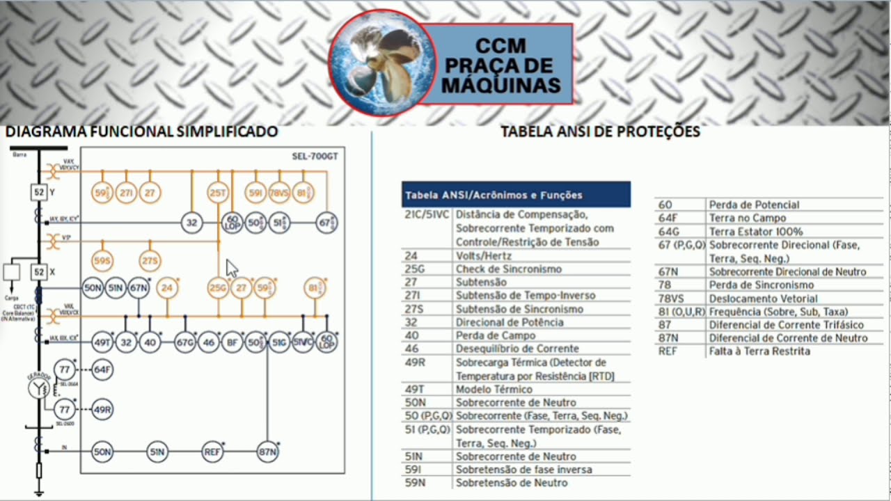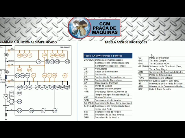 pegar proteção 59 sobretensão [Música] a proteção 60 perda de potencial outra proteção bastante utilizada proteção 67 sobrecorrente direcional proteção 81 também bastante importante principalmente na nossa aplicação marítima tá é subir ou sobre a frequência 81 h81 Lobo é Lilo 86 também a gente usa em máquinas maiores a geradores síncronos proteção diferencial de corrente bom Então essas são as principais proteções o relé sel traz cada uma delas se a gente tem a opção de usá-la aqui a gente vai fazer na prática o cálculo e ajuste da proteção 32 de um gerador de eixo o mesmo que