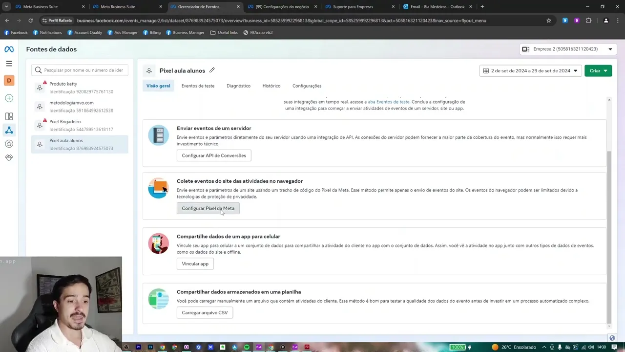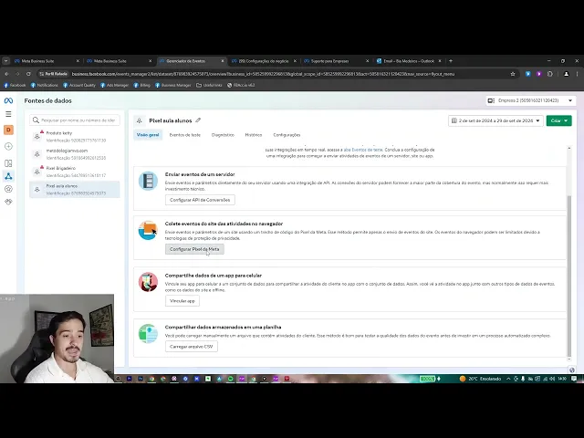 basicamente a mesma coisa e o que mudou aqui foi um botão outro isso aqui eu vou explicar para vocês etc ã Então vamos lá então só para vocês entenderem você vou criar um pixel no Facebook quando você tiver na sua conta você vai eh clicar eh em gerenciador de eventos Você vai clicar aqui em gerenciador de eventos Quando você clicar em gerenciador de eventos você vai eh cair diretamente aqui no gerenciador de eventos do Facebook e aí quando você for eh trabalhar aqui no gerenciador de eventos você vai vir aqui em conectar dados quando você