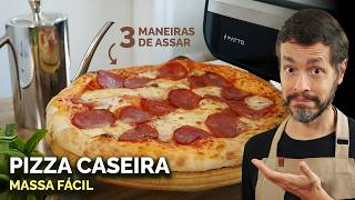 Desse jeito, ela pode ficar refrigerada até de um dia pro outro O importante é que ganhe volume, só não pode fermentar demais Retira o gás da fermentação e vamos voltar para bancada Primeiro divide a massa em duas partes iguais, uma a gente vai trabalhar agora e a outra embala de novo e deixa esperando na geladeira Pode polvilhar um pouco de farinha na bancada e começa abrindo no sentido do comprimento, sempre partindo com o rolo do meio pra cima ou do meio para baixo. Dobra ao meio e vamos abrir mais um pouco… Tenta chegar a mais ou menos 20 cm por 15 Eu vou colocar ela de novo no plástico e guardar entre duas tábuas para manter o formato. Deixa uns 15 minutos na geladeira Enquanto isso, pode pegar a outra massa que ficou guardada e abrir do mesmo jeito Vamos então tirar a primeira do plástico, colocar sobre a tábua levemente enfarinhada e cortar os 3 lados mais irregulares Divida ao meio e cada metade em 3 partes iguais.