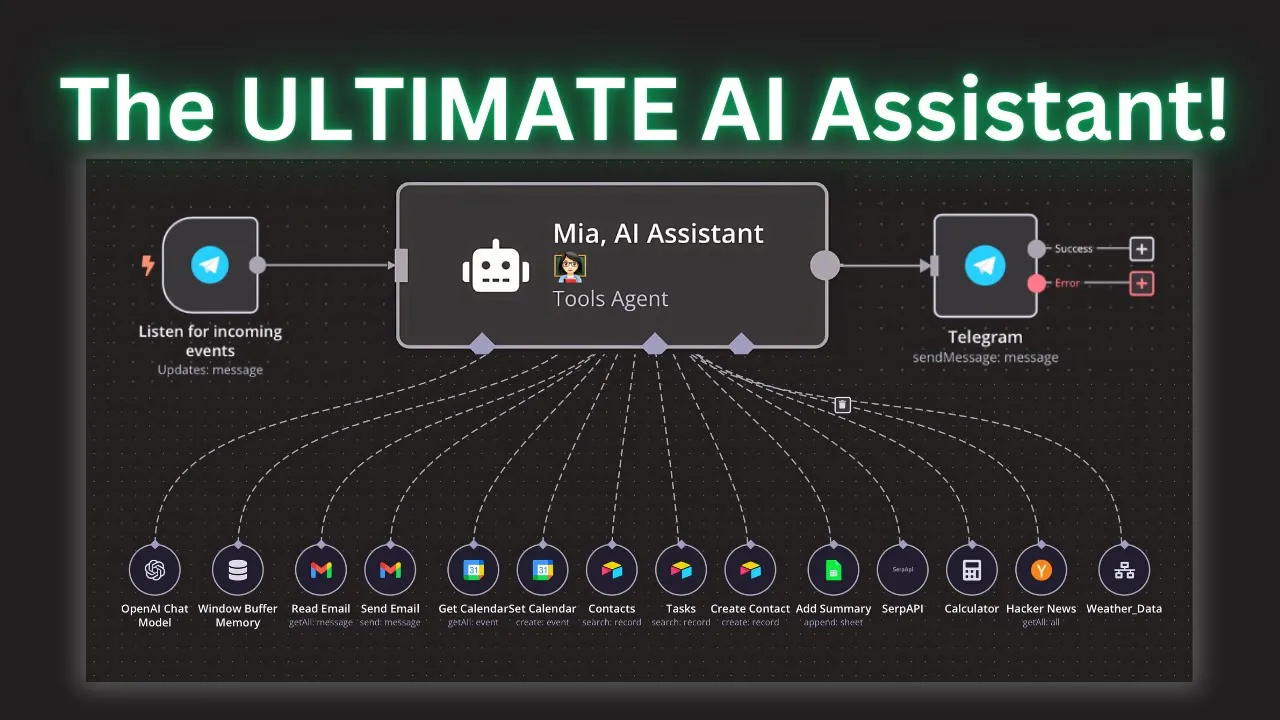 you've probably seen YouTube videos on building AI assistance but what I'm about to show you in this video takes things to a whole new level I refer to this as the mother of all AI assistants because this is truly a Powerhouse this AI assistant can pretty much handle every single task you throw at it from tasks like getting email sending email getting calendar events setting new calendar events updating records and databases creating new records and databases getting tasks accessing the internet access ing Hacker News accessing additional workflow tools that you can build to add more functionalities to this accessing private data via Vector databases all within the same AI agent stay with me till the end because I'll show you how to build this AI agent that will practically automate every single task you need giving you more time and less hassle if you're not familiar with this tool don't worry about it I'm going to walk through step by step over everything you don't have to know how to code I'm going to show you exactly how to build this and on top of that for those of you who are in my school Community I'm going to build this live on Friday at 4:30 p. m. so that way you can follow me a step by step and ask any questions during the call and if you can't make the call that's fine I'll also record that and post it on the classroom section so that way you can have access to it anytime and then obviously you will have access to this template as well for those of you who are new to the channel my name is Zar my YouTube channel and my school Community is all about building incredibly practical and useful AI agents for personal or business use cases we have really great community memb members who are always active and helping each other lending a hand and also providing great questions and answers so that way you can update your skills and building no code AI agents using naden and other tools as well in my school Community you'll have access to exclusive things such as this custom GPT that I built that is only available for my school community and then also I have on daily calls so that way if you're building an AI agent or you following one of my tutorials and you get stuck somewhere you can jump into one of the calls and ask your questions or you can post your questions in the ask and assist Channel myself or somebody will be able to get back to you and provide that answer all right so let's get started so the initial interaction for this is going to be done via telegram but it's up to you if you want to use some other uh tool like a chat bot you can certainly do that as well but telegram is great because you will have the ability to actually ask a question either via message or also via voice as well so we can practically use this like Siri and ask it all of the questions or give it instructions and then we'll go ahead and update everything so let me quickly give you guys a demo of what this looks like and then I'm going to show you the different noes that I used and the different techniques and parameters so that way you can build a version of this of your all right so let me pull up the telegram here so let me go to the bottom so let's start first of all with getting emails right so to show you right now let's say I have three emails that are unread so I've said that only provide the emails that are unread to me so when I'm asking the AI assistants to give me my emails it should only provide me a summary of the unread emails that are in my inbox only I'm going to use my phone but you'll be able to see this on the telegram VI right here but let me go ahead and click on the test workflow here so I'm going to click on test workflow and right now this telegram uh trigger is saying waiting for you to create an evented telegram so let me go ahead and say hi Mia do I have any emails today so it's going to transcribe my voice text to speech and it's going to reach out to the proper um tool which is the read email and it's going to summarize all of the emails that I have which are the three unread emails as you can see right there and if I go to my inbox these are the three only uh unread emails that are there so getting emails getting calendars they're all pretty much the same they're simple task but let's go ahead and test out getting uh some details from our database so in this case I've used air table so I'm going to go ahead and try to retrieve the um contact information that's sitting in my database so let's go ahead and do that so this time I'm going to type instead of uh sending the message via voice so I'm going to click on testing again pull up the telegram app you can see so I'm just going to type can you get me John Do's contact information if I press send so now this time it's going to reach out to the contact database which is the correct one and it's going to give me the contact information for John do which the email is John and the phone number is 114 668 so let's double check to make sure it's correct John do John Gmail 1114 668 so as you can see it reached out to the proper table because we have two tables there's another one called the task table which now let's go ahead and see if we can pull up the task summary from this particular table so same thing I'm going to utilize the voice message again let me get rid of this click on test flow again hi Mia can you get me my task for tomorrow so I'm going to submit that again it's going to create the test it's going to reach out to the proper uh table record and it's going to provide me a summary of all the tasks as you can see right here I have F five tasks setup School Community create YouTube content calendar as as you can see right here on my table here set up school Community create YouTube content calendar so all of this data is being retrieved from the proper database and same thing I have access to Ser API which means that I have access to Google all from here um I have access to calculators so if I need to do any kind of pr