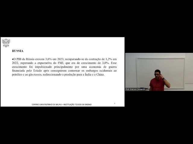 6 de 2003 2023 mesmo com a guerra recuperando-se aí da contração de em 2022 eh esse crescimento né entende que foi impulsionado por uma economia de guerra financiada pelo Estado após conseguirem contornar os embargos ocidentais aos ao petróleo e o gás Russos redirecionando a produção paraa Índia e pra China a Europa parou de comprar esses produtos eles conseguiram passar a vender pra Índia e pra China e mantiveram aí né o o crescimento o Japão o pibe do Japão expandiu em zer % no quto trimestre de 2023 eh revisando aí para cima né Depois estimativa preliminar indicar contração de 0,1 contração redução né escapando assim de uma reção técnica visto que o PIB se contraiu em 0,8 no terceiro trimestre do do ano passado a recuperação ficou a quem da expectativa de mercado que era de crescimento de 0,3 crescimento aí foi impulsionado ado principalmente pelo investimento Privado não Residencial né um crescimento em torno de 2% ante a queda de 0,1 do do trimestre anterior pelo comércio externo líquido um aumento de ponto 2. 6 na exportação superando aí o crescimento de 1. 7 na importação então Japão com uma previsão de crescimento também bem eh conservador né no todo o que que a gente tem do de acordo com os relatórios recentes do Banco Mundial do fundo monetário internacional de da organização para cooperação e o desenvolvimento econômico o crescimento da economia Global em 2024 deve ser um pouco menor do que do ano passado um pouco maior do que era esperado nos relatórios anteriores dessas instituições ele vai ficar ali né previsão de de 2024 era um crescimento baixo eh mas não vai ser tão baixo vai ser um pouco maior mas não eh mas é mais mais baixo do que comparado com o 2023 para essas entidades de maneira geral as causas de desaceleração da economia Global são as políticas monetárias né todos os países com taxas de juros maiores para poder segurar qu ter inflação mercado de crédito apertado se você tá com taxas de juros maiores né o dinheiro fica mais caro e as linhas de crédito também oferecidas principalmente pelos governos estão restritas comércio internacional fraco você tem aí eh vários eh várias notícias né de países reduzindo compras de de produtos de outros países a retirada do apoio fiscal havido na pandemia no período da pandemia muitos muitos eh benefícios né esses apoios aí principalmente na parte eh de de de impostos né voltam agora de forma normal as dívidas públicas elevadas nós passamos por um período de pandemia e a gente tem que ajustar esse período né a gente precisa pagar essa conta então nós estamos desequilibrados ainda eh herdando eh um o impacto da pandemia dentro das contas públicas e o baixo crescimento da produtividade se você não tem produtividade Você também não tem receita pro governo né então vai demora eh demora um pouco mais ainda para você repor todo esse esse Impacto causado pela pandemia e o e o processo né o a a queda de produção os riscos para realização desse crescimento são quais são os riscos o por que que a gente eh eh tem que tentar evitar né porque senão a gente não vai conseguir esse crescimento aumento do Risco geopolítico que poderia elevar o preço da energia com consequências para o crescimento é a inflação stresse financeiro devido aos juros altos a inflação persistente a gente não consegui controlar essa inflação um crescimento Menor da China devido ao aprofundamento dos problemas do setor imobiliário fragmentação comercial e os desastres climáticos Esses são eh pontos né riscos que a gente tem para eh promover um um crescimento como risco positivo o fator que poderia fazer o crescimento ser maior do que o esperado eh a desinflação mais rápida poderia levar a maior flexibilização das condições financeiras Então se a gente tá reduzindo a inflação de um de uma forma bem mais mais rápida o você tem aos poucos né Essa estabilidade e a queda das taxas de juros aonde o a gente pode retomar o crescimento em 2024 a economia Global deve registrar crescimento lento pelo segundo ano consecutivo principalmente devido ao efeito das elevadas taxas de juros né além do enfraquecimento então da China eh isso ocorre depois do crescimento Global ter superado a expectativa de 2023 Resistindo A numerosas V contrários especialmente os geopolíticos quanto a inflação às entidades internacionais avaliam de maneira geral está caindo mais rapidamente do que é esperado na maioria das regiões por conta da resolu da resolução de questões do lado da oferta e da política monetária restritiva né governo tentando segurar aí a inflação de qualquer jeito prever que a inflação volte à meta da maioria dos países do grupo G20 até o final de 2025 próximo ano né Mas seria cedo ainda para se ter certeza de que as pressões sobre os preços estão totalmente con tigas Nós não sabemos se até 2025 a gente consegue ter todo esse controle e a retomada né a baixa das taxas de juros e aí A retomada do crescimento condições do mercado de trabalho tornaram-se mais equilibradas mas o crescimento do custo unitário do trabalho permanece geralmente Acima das taxas compatíveis com os objetivos da inflação de Médio prazo pro FMI a inflação deve se reduzir de 6.