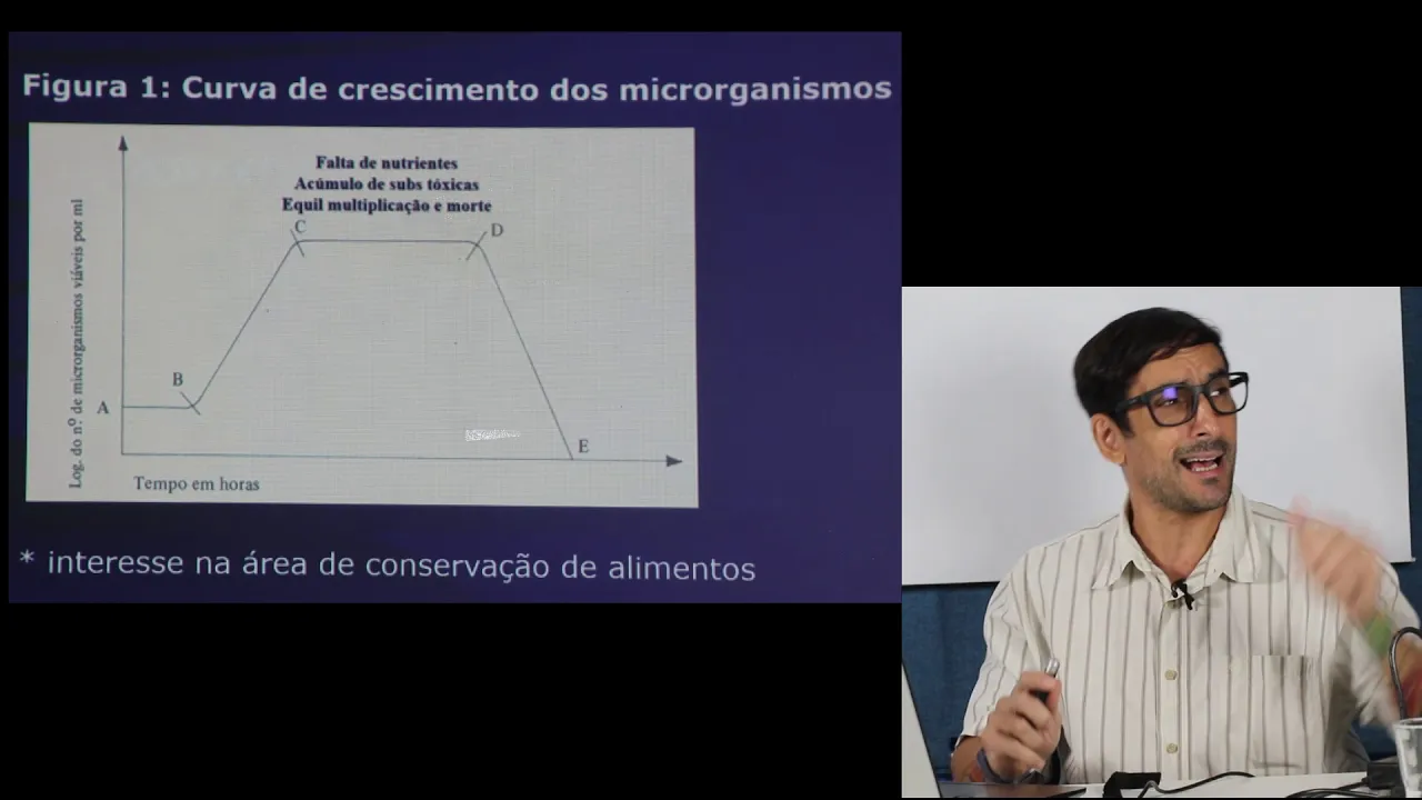 e aí e aí e aí e aí olá olá e esta é mais uma aula realizada em parceria com o professor leandro neves do departamento de fitotecnia centro de ciências agrárias da universidade federal de roraima curso de agronomia neste vídeo vamos tecer alguns comentários sobre o crescimento microbiano em função do tempo enfocando alguns aspectos envolvidos na produção e conservação de alimentos pela atividade microbiana desta forma vamos mostrar como e quando devemos ajustar as condições necessárias para que os microorganismos e tu é na produção de alimentos e bebidas tais como pães queijos vinhos cervejas ou na