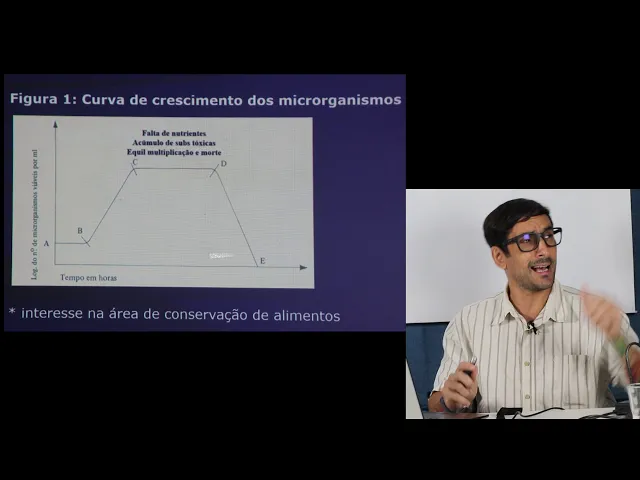 produção de substâncias como os ácidos lático e acético que são muito importantes na indústria de conservação de alimentos e com a palavra o dr neves obrigado para o seu armando até até aqui então nós tivemos um apanhado geral da microbiologia dos alimentos mais especificamente abordando as duas principais áreas de estudo aqui que é a produção de alimentos a partir do crescimento do metabolismo microbiano ea conservação também de alimentos a partir da produção de metabólitos dos mesmo microrganismo só que a partir de agora então nós vamos nos ater especificamente a curva de crescimento microbiano vamos entender