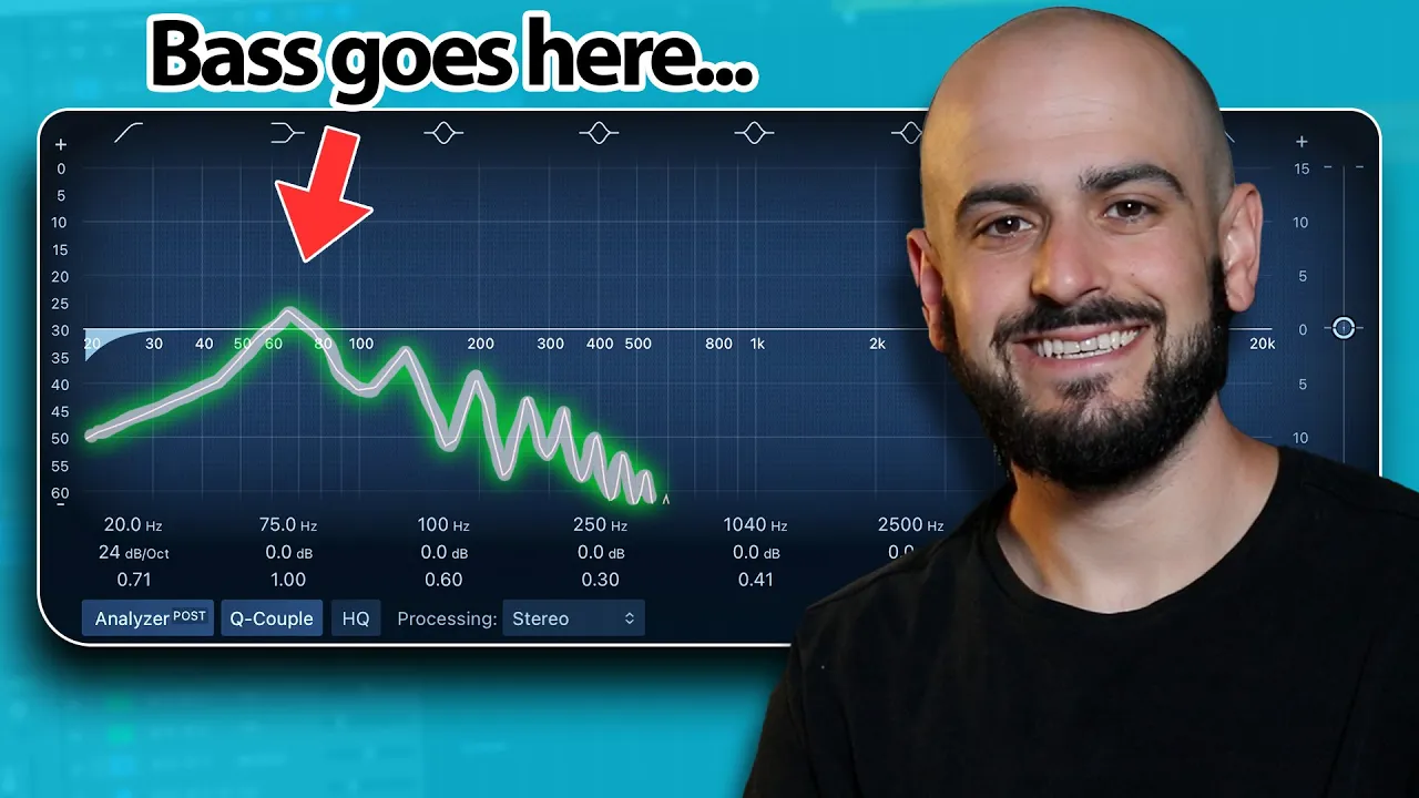 of your chords or you're going to have a baseline that focuses on the tonic of the key signature that you're in in this case it's a melodic song so we're going to use the bottom note of the chords we're going to go to this bass sound get rid of these not sure what he was doing there and we're going to place the base notes when making a baseline you should have an EQ open at all time and you should be looking for an octave that gives you the strongest frequencies between 40 and 80 Herz those
