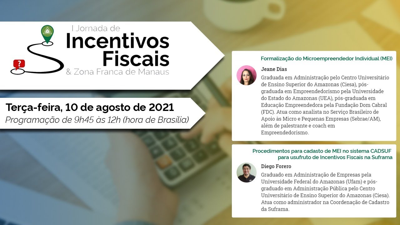 e gostaríamos de lembrá-los que nós tá programação do evento continuar amanhã as 9:45 horário Brasília uma formalização do microempreendedor individual apresentada por senhora adiante e do SEBRAE Amazonas também será ministrada palestra procedimentos para cadastro do meio do sistema katz ulf para usufruto de Incentivos fiscais da Suframa comunicamos que os limpe os links das palestras estarão disponíveis ao público na plataforma do YouTube no canal oficial acompanha Jornada ao longo da semana pois as palestras que serão transmitidas ao vivo que não serão transmitidas ao vivo serão gravadas para ficar disposição do público agradecemos pela compreensão A cerca