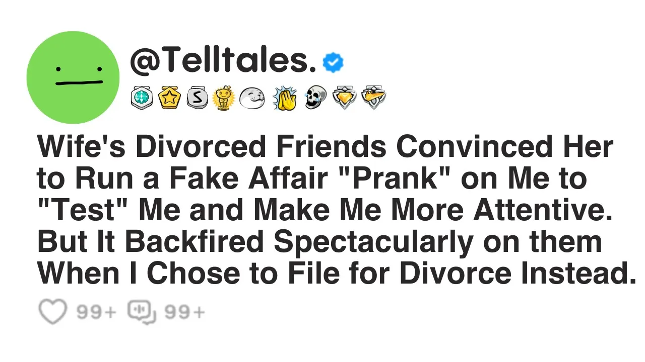 wife's divorced friends convinced her to run a fake affair prank on me to test me and make me more attentive, but it backfired spectacularly on them when I chose to file for divorce instead. So, my wife Sarah and I have been married for 8 years, and things have been good. Not perfect, but good.