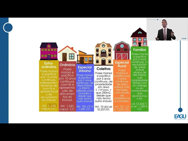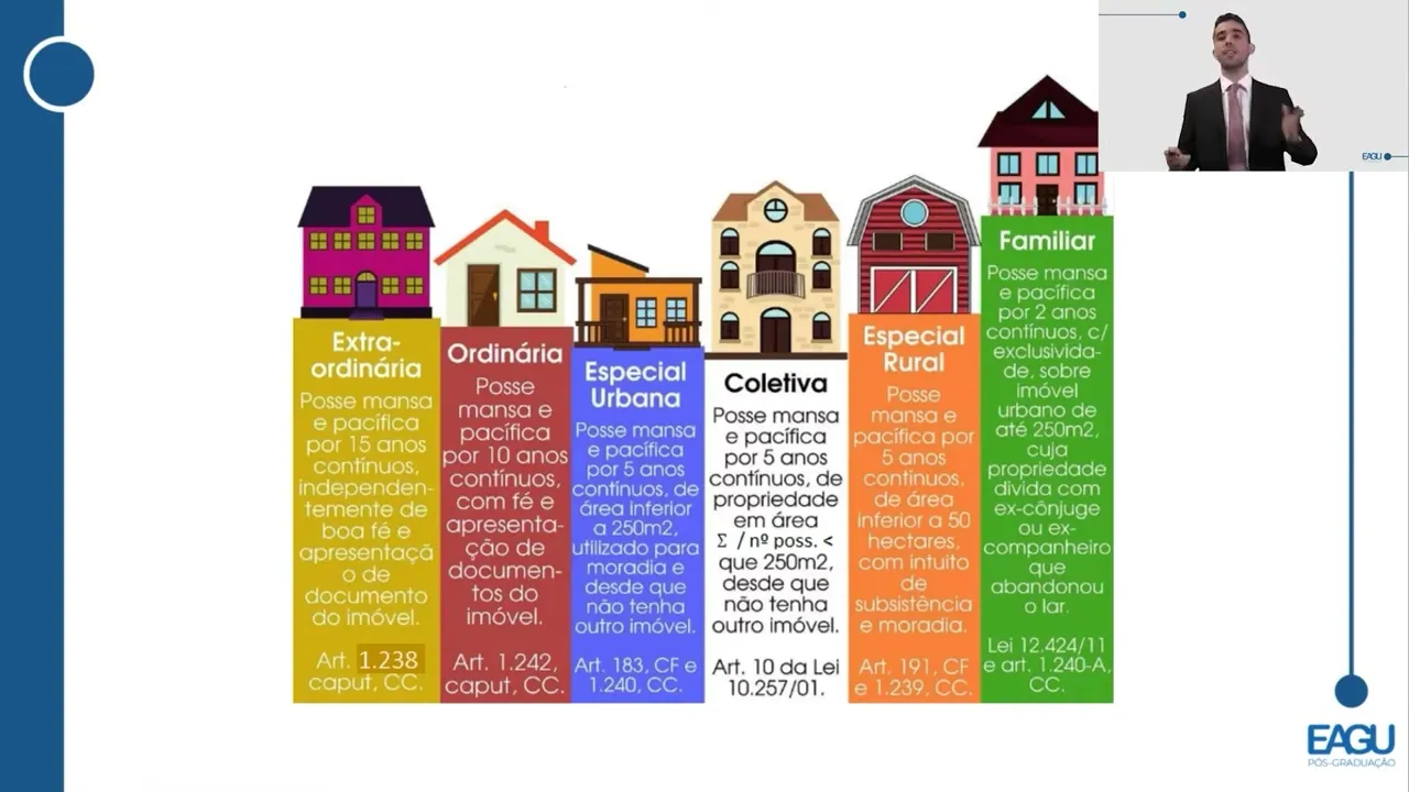 [Música] senhores eu acabei de trazer para vocês aí as hipóteses de o usucapião extraordinária e ordinária mostrei para vocês aí que os prazos são 15 e 10 anos mas isso que pode ser reduzido para 10 e cinco respectivamente atendendo mais requisitos a ideia aqui pessoal é o seguinte quanto mais requisitos menos tempo quanto menos tempo mais requisitos tá então mantenham essa lógica que fica fácil de entender eu tenho senhores além desses dessas duas modalidades as chamadas US as usucapiões constitucionais ou usocapião especial elas são previstas diretamente na Constituição Federal elas estão no código civil Mas