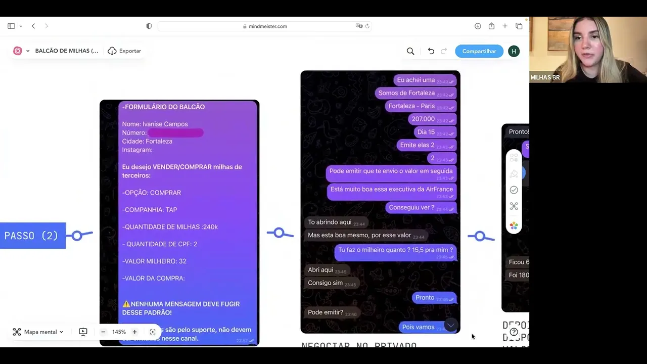 que é a mesma coisa de pessoas e Val milheiro a 32 depois que env o formulário você aguarda algum fornecedores entrar em contato seja ali pelo chat do grupo do balcão ou por no privado independentemente da onde quer que ele lhe chame ou ela você precisa levar essa negociação pro privado quando você chega no privado você precisa eh enviar e comentar as informações complementares da emissão origem destino data reiterar ali o programa Fidelidade porque vai que esgota para ver se se esver esgotado procurar em outro ver em outro programa e vai que o fornecedor não