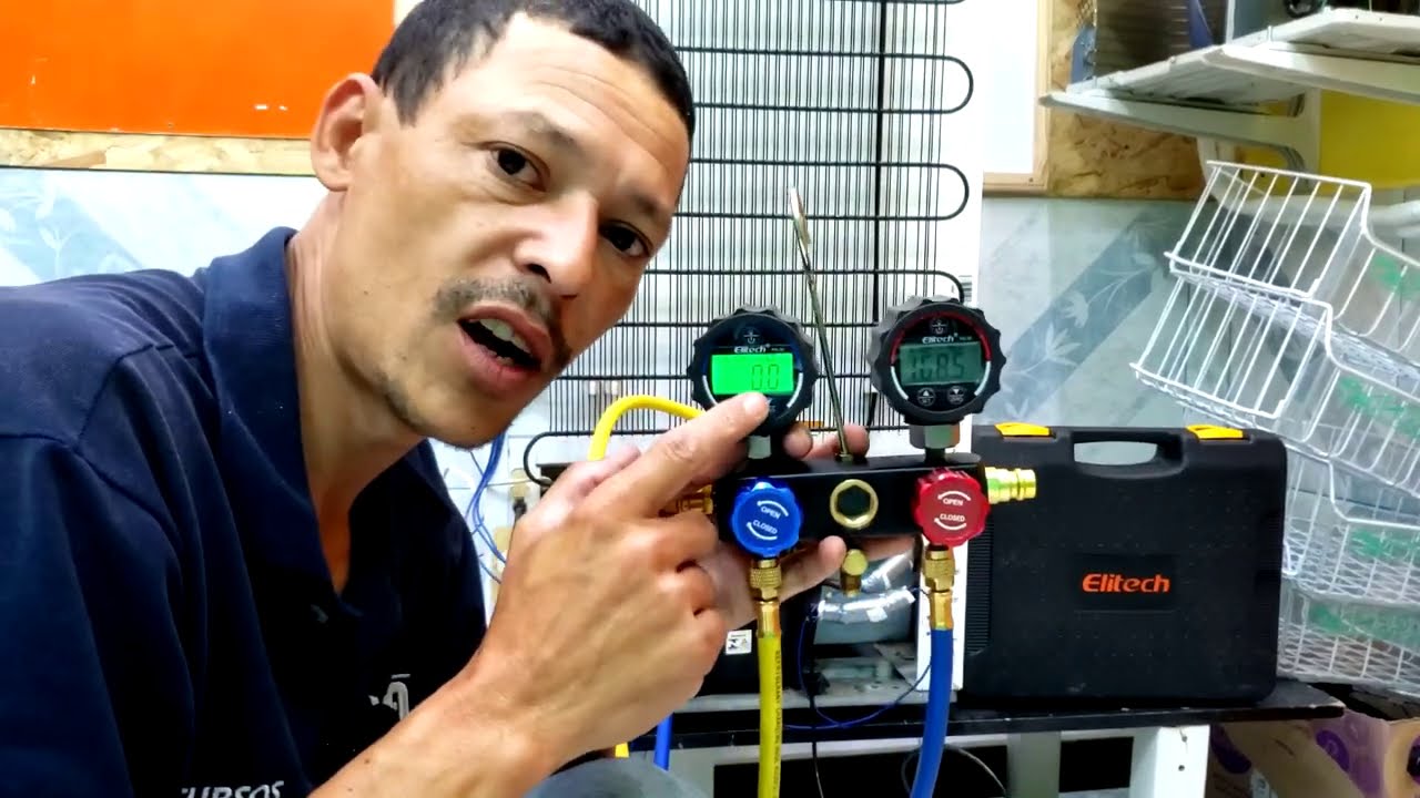 tô com r404 a onde eu vou fazer a carga de fluído refrigerante e eu tenho que fazer a modificação no meu mifold Ou eu posso fazer através dessa tela ou através do aplicativo Primeiro vou mostrar através da tela aqui ó basta você pressionar simultaneamente até para cima e para baixo ó simultaneamente vai começar a piscar ali o fluído refrigerante e agora só é você navegar com a seta para baixo ou para cima vou para baixo ver se encontro 404 não para baixo só tá mostrando Flu refrigerante menor vou jogar para cima Até chegar no 404