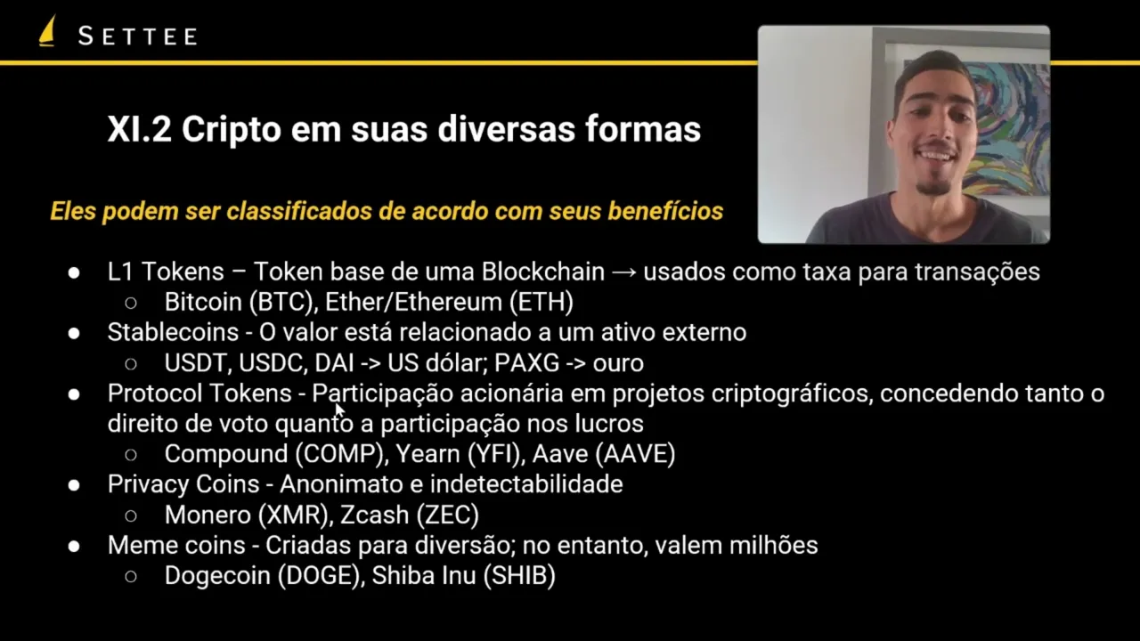 tem as suas chaves privadas você tem acesso às suas cripto somente você controla não está na mão de um fiduciário não está na mão de uma terceira entidade que decide o que fazer com os seus bens contando que você tem as suas chaves privadas que controla quem tem acesso final último aos seus ativos criptográficos é você nenhum banco pode congelar a sua conta no banco pode impedir que você envia uma transação Então esse é um outro ponto Muito chave da ideia de rapidamente é cobrindo aqui uns principais tipos de cripto a gente tem muitas muitas