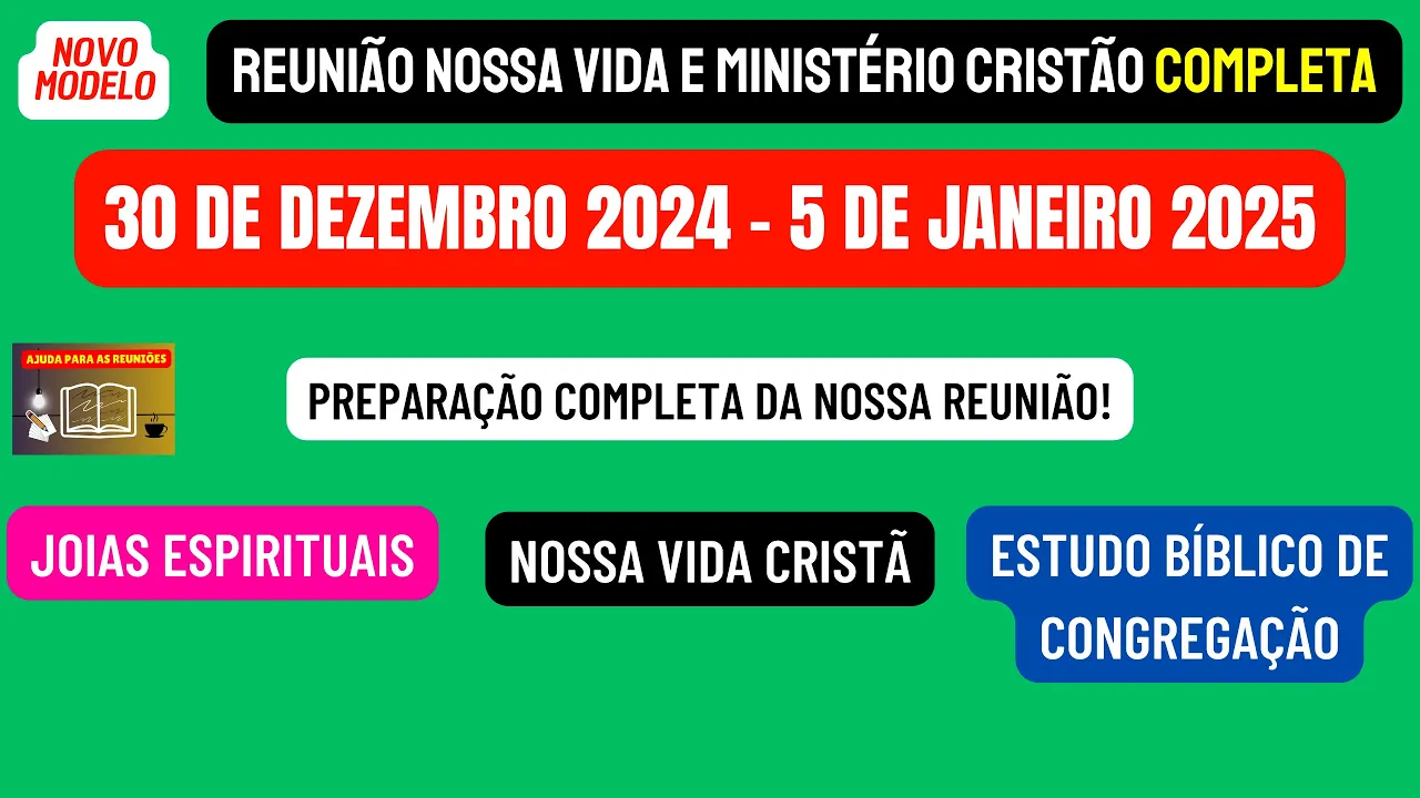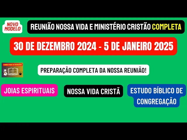 sejam todos bem-vindos ao nosso canal ajuda para as reuniões Esperamos que Jeová esteja com todos vocês queridos e amados irmãos e neste vídeo vamos estar disponibilizando a reunião nossa vida e Ministério Cristão completa desta semana 30 de dezembro de 2024 a 5 de Janeiro de 2025 de maneira objetiva vamos analisar as partes principais desta reunião que são aquelas por perguntas e respostas onde podemos dar nossos valiosos frutos de lábios nossos comentários iniciando nós vamos preparar algumas joias espirituais que podemos encontrar na leitura da Bíblia desta semana dos livros do Salmo 120 a 126 Lembrando que