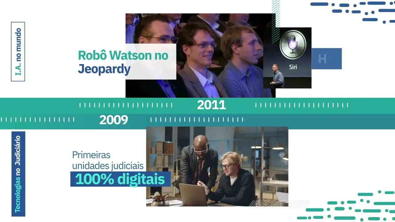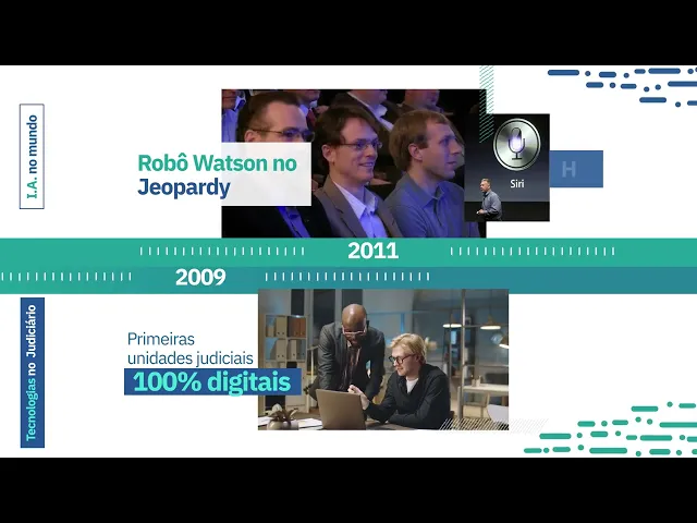 mundo em 2011 o robô provou que máquinas podem vencer humanos mesmo em um programa de perguntas e respostas na TV e hoje usa sua inteligência no diagnóstico do câncer e em análises financeiras isso no mesmo ano em que a Apple lança a assistente pessoal Siri presente na vida de tantos usuários em 2012 celebramos avanços significativos nos algoritmos de reconhecimento de padrões artificiais além disso a primeira licença para dirigir um carro autônomo foi concedida inevada Estados Unidos comprovando a eficiência e segurança da tecnologia em 2013 foram realizadas as primeiras videoconferências no judiciário a ministra realizou audiência