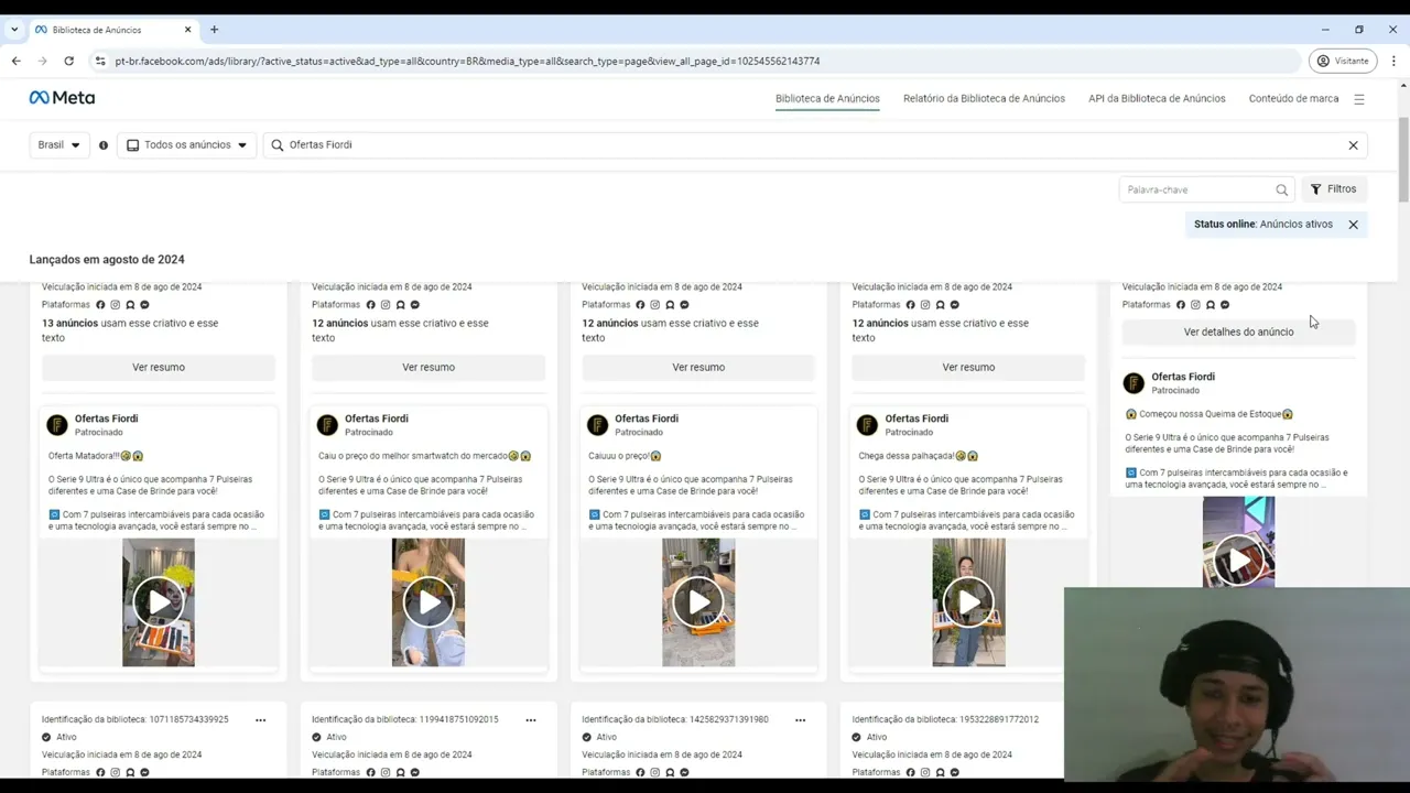 000 respostas então tipo assim pô é é um público mais segmentado não é legal eu não trabalho eu gosto de trabalhar quando eu tô fazendo uma pesquisa em em palavras mais Amp para encontrar o pessoal que tá escalado beleza escala que que vocês T que entender quem ter um anúncio 12 anúncios não tá escalando nenhuma ele tá testando o produto e verificando ele não tem caixa para escalar mesmo que tem o produto na mão e você tem que entender quando você tem um produto na mão é importante o time cara tenha dinheiro para você escalar beleza Ah não tem dinheiro para escalar beleza faz o quanto você consegue gastar para aquele produto se ele dar um retorno sobre aquele inv invento então vamos aqui em dinheiro beleza e vamos fazer uma pesquisa aqui que que eu olho na pesquisa em si beleza eu deixo o filtro já vem por padrão todos os ativos aqui dentro eu olho isso aqui ó tá vendo a sequência de anúncio desse pessoa aqui ó Pô legal cara tá tá com termo legal ó três anúncios Pô dá pra gente começar a olhar só que aqui eu tenho um segredo o Facebook em si você vai perceber tá vendo esse anúncio aqui ó por exemplo essa identificação desse anúncio aqui ele fala quando foi iniciada a veiculação dia 8 de agosto a gente tá gravando dia 9 de agosto aqui os anúncios beleza e aqui eu encontro sempre algo mais legal quando tem algo assim ó por exemplo três anúncios Cara isso aqui é um trabalho bem de filha da você tem que minerar minerar minerar Existe dois tipos de produtos não só dois tem outros tipos de produtos mas a gente tá aqui focando tem tanto infoproduto quanto produtos físico se você tá fazendo drop Sei lá cara isso daqui é mineração de um produto Beleza então por exemplo aqui aí eu olho aqui ó o cara tem três anúncios hum interessante isso daqui é um drop é como que eu faço para ver se ele tem mais anúncio ou não entendeu primeiro eu olho aqui nessa linha se ele tá trabalhando na mesma faixa mas não tem olha esse cara aqui ó por exemplo ó oferta fiorin sei lá que é essa olha quantos anúncios que tem aqui já apareceu somente no termo amplo da palavra que que eu faço eu já gosto quando o cara tá assim ó oito anúncio e eu vejo o resumo quando eu vejo que o resumo é o mesmo vídeo o cara tá fazendo uma escala é como que fala Horizonte vertical horizontal Como assim cara o vídeo deu bom então ele só duplica campanha duplica duplica duplica até D Bom D Bom D Bom D bom e ele tá subindo muito que que eu faço eu fico fiquei curioso desse cara aqui que que eu faço eu venho aqui ó passo o mouse em cima põe ver anúncios Nossa ess cara vai ficar puto mas é isso que acontece mano tem como camuflar isso aquii também viu tirar da biblioteca de anúncio se não tirou da biblioteca de anúncio cara eu vou achar seu produto Vou Clonar seu produto e vou subir seu produto e se fazer dinheiro e eu tiver caixa vou escalar com seu produto fazer caixa e depois eu saio do seu produto vou pro próximo produto isso daqui é ofertas né não é um produto em si a gente falar sobre conceitos de produto e depois posso explicar em outro vídeo como você cria um produto E não uma oferta isso daqui a gente tá procurando uma oferta que a gente vai ganhar dinheiro então se você perceber eu tô filtrando somente pelos anúncios ativos esse cara aqui tá escalando cara pode colocar aí r$ 5 para cada anúncio que não é isso que ele tá fazendo então se você tá fazendo anúncio você coloca pelo menos um gasto mínimo de um ticket a um ticket e meio entendeu porque eu não gasto menos que um ticket e meio dentro das minhas ofertas pra gente testar validar a oferta e quando tá dando bom cara o CPA tá bom tá respeitando o CPA a gente pode falar sobre o cálculo de CPA mano eu meto o dedo tipo assim mano Pode meter o dedo sem dó se você tiver R 30. 000 tiver 300. 000 para gastar no dia mano mete o dedo entendeu E só controla controla entendeu só tem que fazer uma regra de controle aí pelo menos de 5 dias de controle ter uma parceria com o getor e quando você tá em escala absurda mano escala Absurda mas seguinte olha aqui ó se você olhar ele tem 400 anúncios em si isso aquii é muito interessante cara muito interessante se eu tirar os ativos vamos tirar os ativos esse cara ainda tem 400 anúncios então ele deve excluir todos os anúncios que não tá ativo vou deixar aqui todos os ativos tá bom aqui ele tá fazendo uma filtragem zinha aqui 490 anúncio o cara tá escalado tá bom ele tem caixa tá escalando isso aquii se ele tá escalando quer dizer que ele tá V ninguém queima dinheiro por queimar dinheiro se você é casa de aposta eles têm um cálculo totalmente diferente então na casa de aposta vocês T que tomar cuidado se você tá pegando um criativo do Tigrinho um criativo do dragãozinho tem que tomar cuidado para saber se o cara é afiliado ou dono da casa porque se ele tiver um CRM interno é ele não ganha no Fronte ele ganha no backend e com o seu CRM em si isso é importante saber tá bom beleza cara que produto que ele tá escalando vamos olhar aqui cara ó Ó Zé curioso ver resumo clica aqui ó segura o control né pra gente não sair da página aí ó é uma lojinha de drop cara kit Smart watch série 9 mano o cara tá escalando essa mano pega os vídeos do cara que que eu faria eu Otávio faria o seguinte vou se você é dan dessa oferta irmão desculpa mostrar essa oferta aqui mas eu pegaria esse modelo de drop que você consegue em qualquer outro lugar shopify clonar essa oferta aqui mano copiar tudo só trocaria esse Fiore porque ó o cara nem colocou marca d'água nem colocou marca d'água aqui dentro ó eu clonar essa oferta trocaria somente a logo aqui mano e se você não tem um registro de marca cara entendeu claria colocaria aqui veria qual que é onde que ele tá fazendo as vendas dele ó aqui ele tem um checkout próprio Ele deve estar rodando na Vega checkout ou deve estar roda