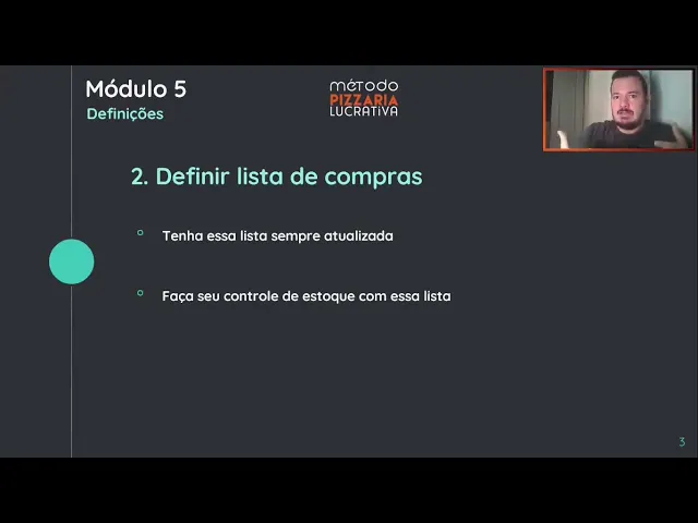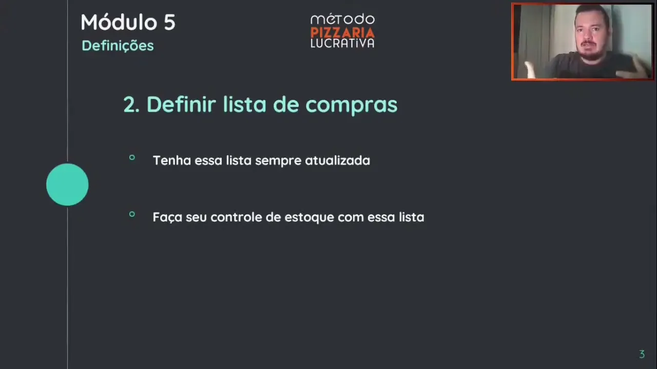 [Música] defini sua lista de compra Por que que isso é importante e você ter ela atualizada porque você vai chegar e e vai vai montar o seu cardápio aí depois que você montou o seu cardápio aí você vai pizza por pizza que vai colocar o que que vai na massa ah na massa vai farinha é ovos margarina sal açúcar fermento pronto Um item você vê que já tem várias coisas aí como eu falei para vocês aí carne de sol então na carne de sol vou precisar ter carne de sol margarina e cebola que é para