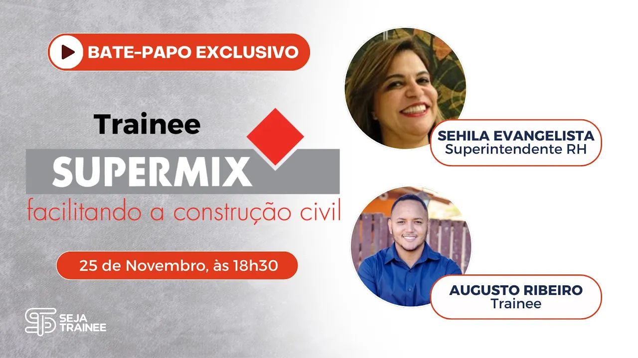 a gente vai estar com duis dois profissionais aqui da empresa da supermix para contar um pouco mais sobre como funciona esse programa de 12 meses de formação tempo integral com plano de aprendizado Job rotation mentoria e desenvolvimento de projeto então é para você criar maior identificação por isso eu falo que saem daqui os aprovados tá bom para você participar desse programa você precisa ter graduação dezembro 2020 a Dezembro 2024 precisa ter disponibilidade de mudança porque eles atuam no país como um todo e dos mais variados cursos aqui de bacharelado ou tecnólogo Tá bom eu quero