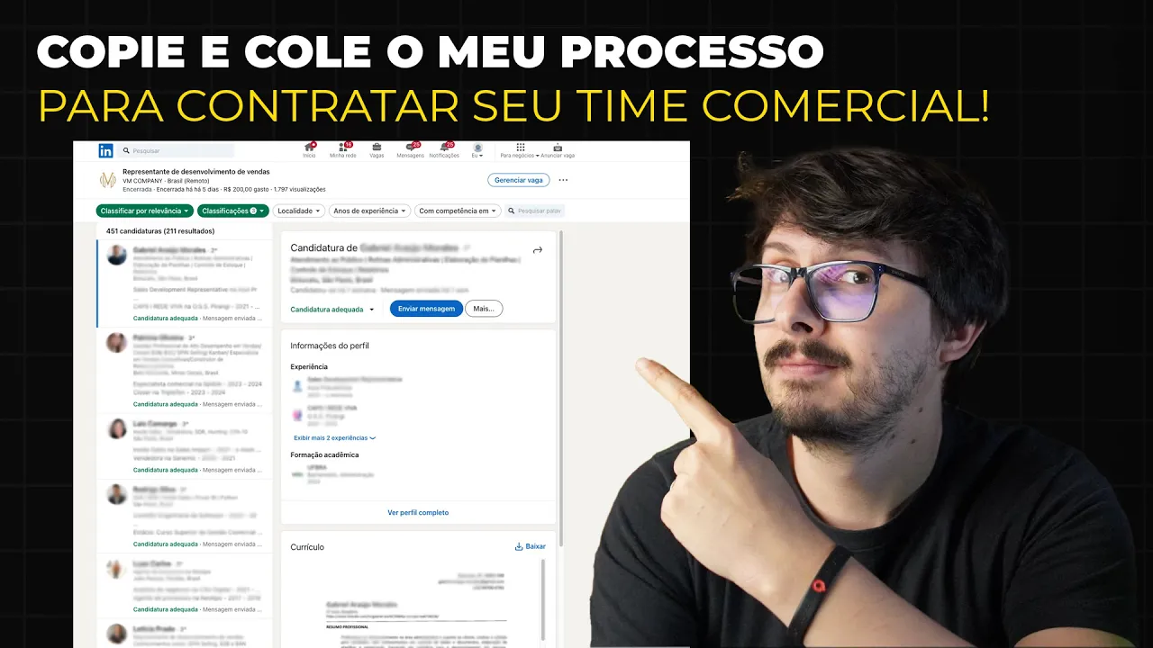 coisa que eu quero que você entenda é o meu processo de contratação não é em mastermind não é no perfil do cara que treina comercial Não é nada disso eu só contrato e não só vendedor tá qualquer vaga aqui na minha empresa eu só contrato hoje via LinkedIn até uma pergunta a última vaga que você preencheu pra sua empresa quantas pessoas você teve interessadas na sua vaga só para você ter um parâmetro É bem interessante até para aumentar o seu interesse nesse vídeo e você entender mais o que eu tô falando aqui tá minha última