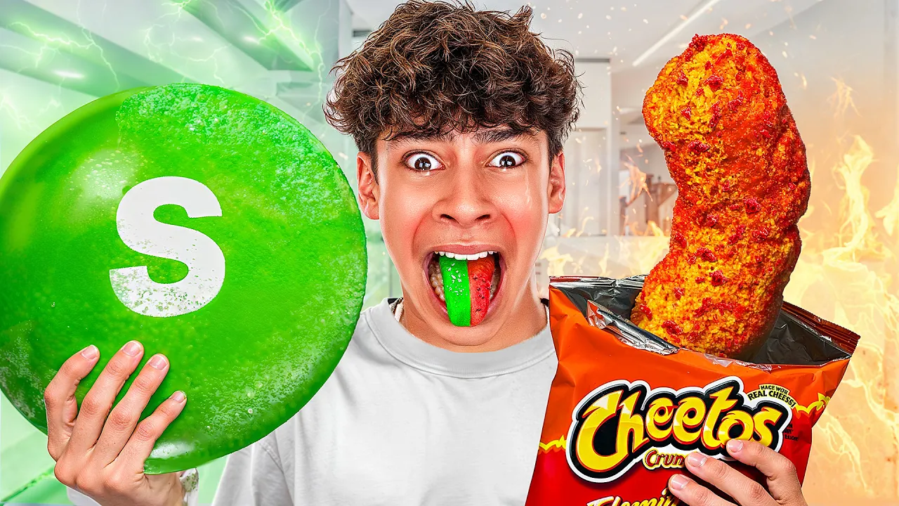 got three 2 1 is this a chizo it's the world's largest hot Cheeto this is very long guys oh my goodness all right remember fron you got sour if you make a face you get a strike Andrea you got spicy if you drink that milk you get a strike you got 2 minutes to eat are you guys ready 3 2 1 eat okay so how am I going to eat this this is so big I'm going to break it in half figure it out yeah I'm going to break it in half it's going to make
