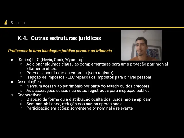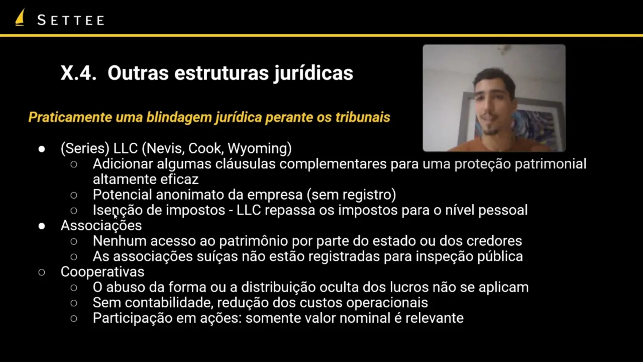 em células Você tem uma célula da LC que basicamente uma super é para ter Imóveis uma para ter criptos uma para ter ações etc e para se conseguir reaver esse patrimônio tem que ser basicamente processar cada uma das eleições em série então aumenta exponencialmente os custos e a demora para alguém conseguir acessar o seu patrimônio Além disso dependendo do país a gente vai ter associações e cooperativas no caso de associações Essas são entidades que são muito favorecidas em países um pouco mais de esquerda geralmente é difícil é muito difícil para o estado ou credores acessarem