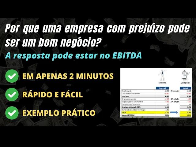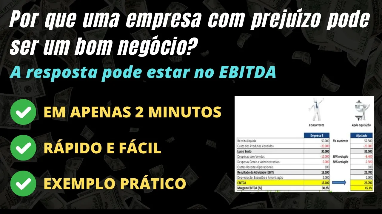 no último vídeo utilizamos um exemplo através de um potencial investidor da empresa a verificando o ibida de uma empresa B para uma possível aquisição veja que o concorrente possui um prejuízo líquido mas o ibda margem era muito maior do que a empresa que estava interessada na sua aquisição após um processo de negociação foi negociada a empresa B por quatro vezes o o valor do seu ibida ou seja 60 milhões nesse exemplo em anexo após aquisição a empresa a conseguiu melhorar em 5% o preço de venda pois eliminou um concorrente do seu mercado a empresa a