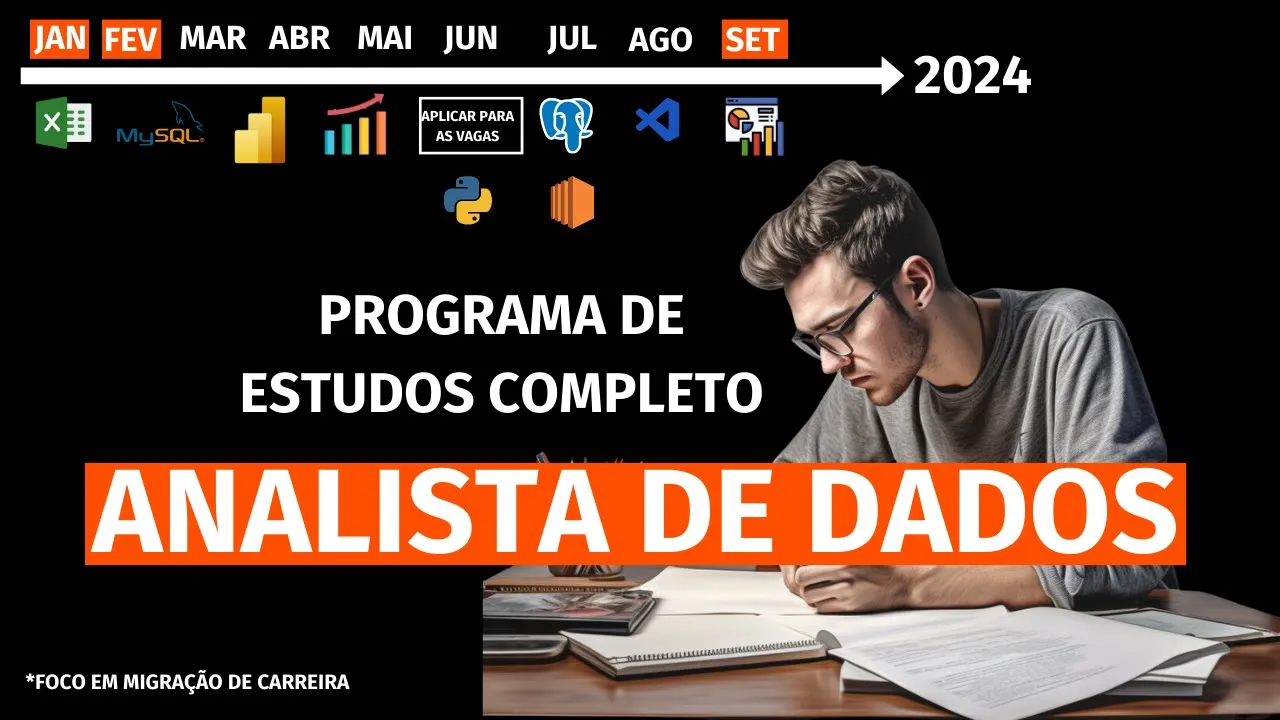 desce nesse vídeo aqui eu vou deixar para você um plano de estudos completo para você se tornar um analista de dados em 2024 porque talvez você queira trabalhar na área de dados mas a profissão de ciência de dados não te atraiu muito porque você entendeu que é muito complexa ou que demora muito tempo ou que é muito difícil de aprender talvez não seja esse o seu perfil mas mesmo assim você ainda queira trabalhar na área de dados E para isso a gente tem uma segunda opção que é a carreira de analista de dados que é