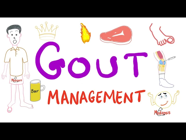 processed simple sugar such as raw sugar brown sugar corn syrup fructose glucose and sucrose patients should instead of this consume complex not simple but complex carbohydrates such as fruits vegetables and nuts which are close to the pudendal nerve if you know what I'm saying here are some tips for chronic management of gout you should not start it during an acute attack you should wait until the patient has no pain the goal is the decrease in serum uric acid level below 6 if the patient has severe gaped how do I note severe your toe fie there