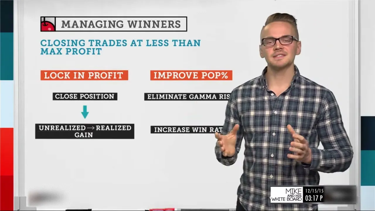 When we talk about managing winners, we're usually looking at the 50% range, but we'll discuss that a little bit further. One thing we do is remove risk from the table, and we'll talk about that in more detail shortly. We can also lock in profits by managing winners.