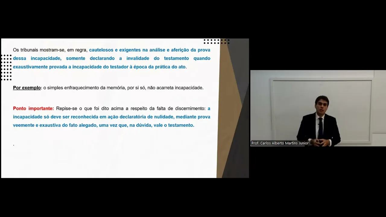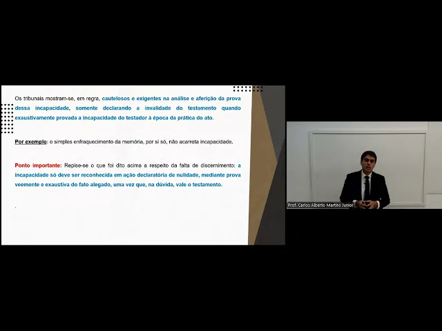 Olá pessoal Professor Carlos Alberto Martins Júnior Direito Civil 5 vamos falar hoje sobre capacidade de testar pegando o gancho da aula passada nós comeamos começamos a falar sobre a a a a a o direito sucessório em relação ao testamento em si então nós começamos a falar sobre o que era o testamento Quais eram as condições as características para ele as disposições legais em relação a ao que deve ao que nós devemos observar para poder fazer um testamento E logicamente para que o conteúdo desse Testamento ele seja válido após o momento do falecimento E hoje nós