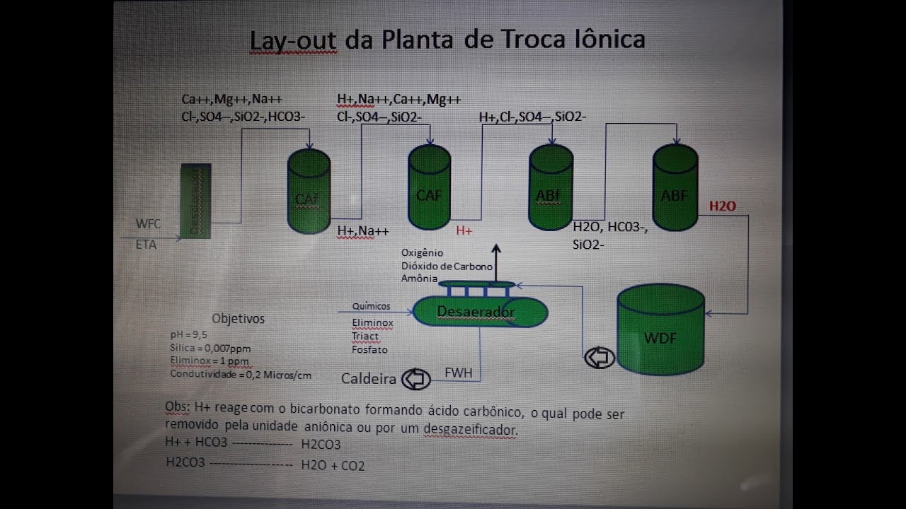 sul fato que chega à medida que a água contém do ácido passar pelo leito ocorre a troca de íons agora local de troca não mais a loja o hidróxido em seu lugar ao sol fato lembre se usa o fato à loja duas cargas negativas e assim para termos um equilíbrio natural a resina solta tolice troca dos com carga negativa os hidróxidos unem-se aos hidrogênios que deixa unidade catiônica e formam água pura e se você multiplicar aquela troca de íons vários milhões de vezes será como a desmineralização é uma maneira eficiente de manter puro a água