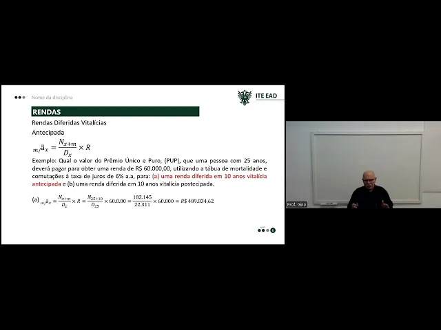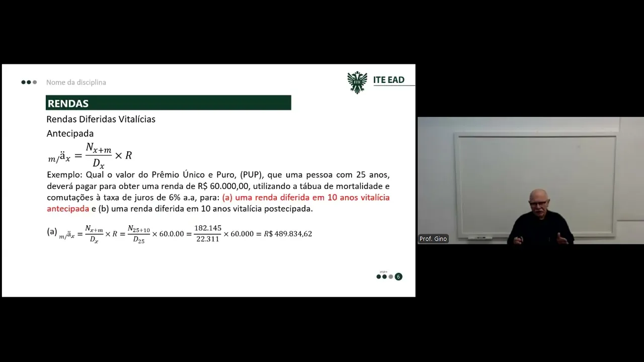 000 por ano se eu viver 20 anos eu vou receber por 20 anos todo ano r$ 60. 000 e sei lá né aí vai depender de quanto tempo eu viver então aí eu vou receber vitaliciamente ou seja já até o resto da minha vida eu vou receber essa quantia Tá bom vamos ver o outro caso Nós estamos vendo agora uma renda que é uma renda diferida vitalícia que que é a renda diferida vitalícia a renda diferida vitalícia é aquela renda que a gente começa a receber depois de um período né então a gente começa a pagar ou a gente paga um determinado valor aí a gente tem uma janela que a gente chama de vazio financeiro nesse vazio financeiro não existe pagamento e nem recebimento então depois de passar do vazio financeiro eu passo a receber uma certa quantia mensal então a fórmula para nós é essa daqui onde o eu tenho aqui o e o m aqui é o que está aparecendo aqui à esquerda da Barra esse daqui é o prazo de diferimento os dois pontinhos quer dizer que a renda é antecipada o X é a idade atual então eu tenho lá NX + m ou seja imagina que eu vou estar o o x é a minha idade atual o m é o prazo de diferimento Ou seja é o prazo é a janela do vazio financeiro e o DX é o x aqui no caso é a minha idade atual tá então calculando a partir disso pegando o valor do prêmio único puro de uma pessoa com 25 anos quanto que ela deverá pagar para obter uma renda de 60. 000 utilizando a tábua de mortalidade comutações a taxa de 6% ao ano uma renda diferida em 10 anos vitalícia antecipada tá Então veja eu vou pagar agora imediatamente eu vou passar 10 anos da minha vida sem receber absolutamente nada e depois de 10 anos ou seja a partir do 11º ano eu passo a receber uma renda de 60.
