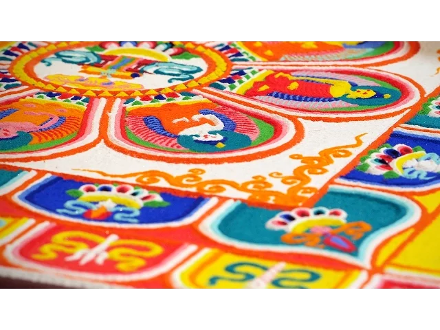 [Music] Tibetan medicine and healing has always been crucial to the Buddhist path so creating a medicine mandula is one way of healing the community but also healing the environment the word mandala is actually a Sanskrit term a meaning container of essence it is that Sacred Circle embodying something sacred Essence within originally they would have used powdered Stones powdered gems things like lapis Malachite and so on today they use crushed marble and made into sand now the colors are very important because they symbolize different attributes of the deities um but in this particular one that we