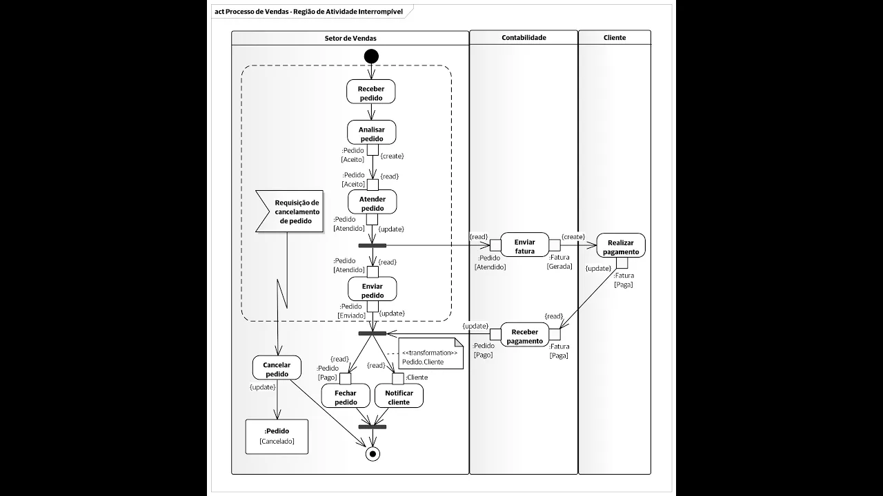 elementos de uma atividade que podem sofrer uma interrupção então a região de atividade interrompa determina que todo processo que estiver envolvido por ela pode ser interrompido não importando em que elemento a interrupção ocorra então Aqui nós temos o exemplo de região de atividade interrompam um exemplo que já havia sido demonstrada em aulas anteriores sobre o diagrama de atividade que é o processo de vendas e nós acrescentamos uma região de atividade interrompem todo esse setor do processo de vendas pode ser interrompido quer dizer que o cliente pode cancelar a compra H enquanto a atividade se encontrar