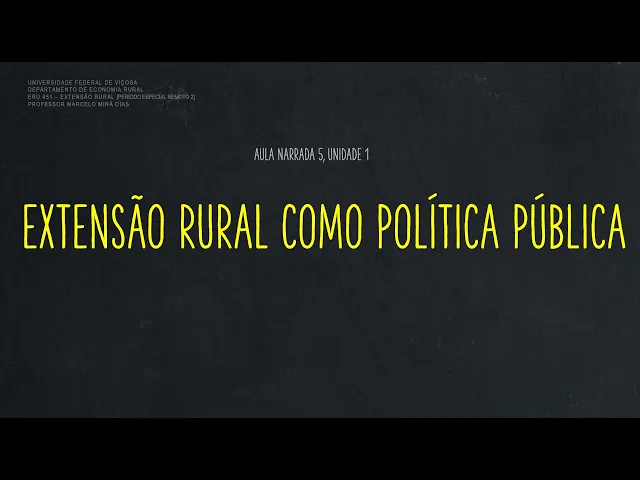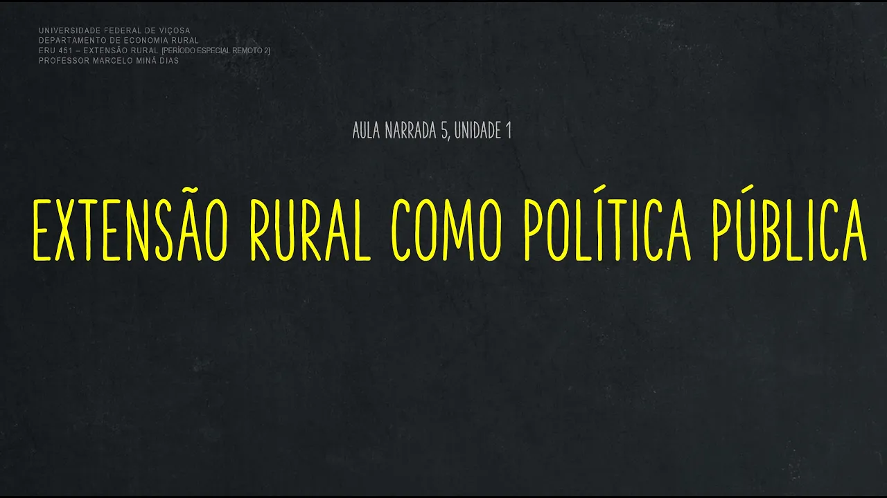 o Olá estudantes da disciplina Hero 451 extensão Rural Esta é a última aula narrada da unidade um seu tema é a trajetória histórica da extensão rural no Brasil compreendida como uma política pública em nosso encontro virtual discutiremos o conteúdo apresentado a seguir boa aula e ao analisar a trajetória histórica da extensão rural no Brasil nós vamos procurar determinados elementos que a caracterizam como expressão da ação do estado e dos diversos governos ao longo do tempo a respeito desta atividade como um direito serviço público e organização Por este motivo afirmamos que a história da extensão Rural