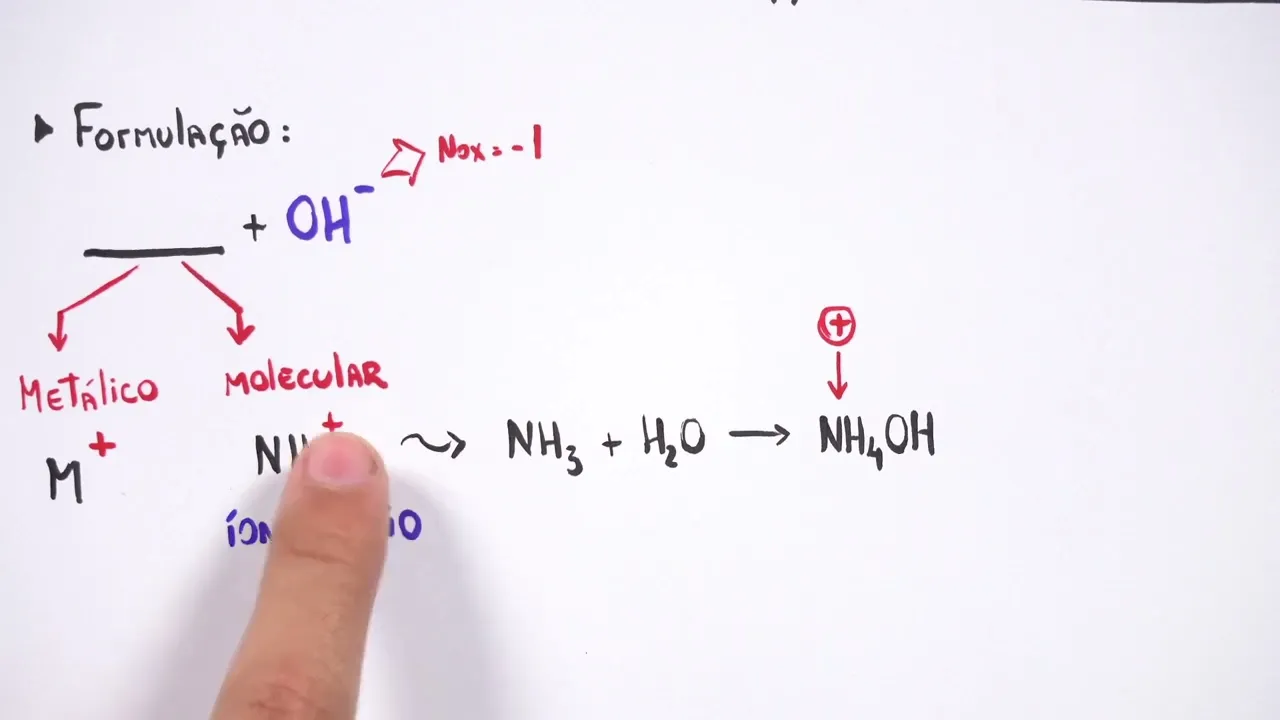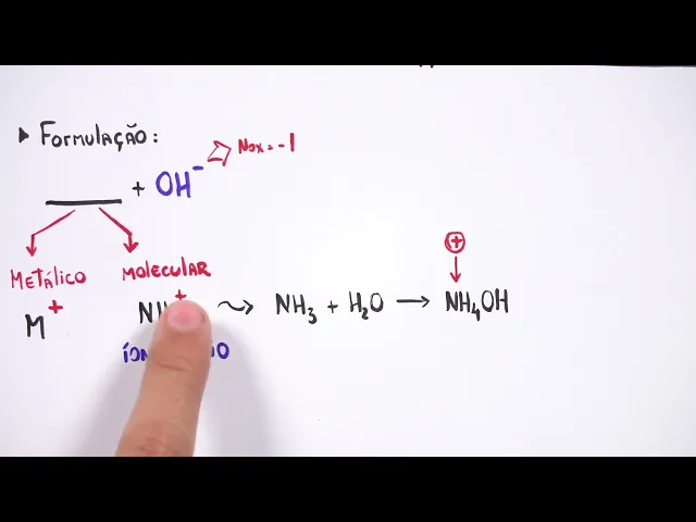 interessante a gente trabalhar com a formulação das bases Professor como é que a gente trabalha com essa formulação o que é que é a formulação da base bom nós sabemos que as bases elas são formadas por alguma coisa que eu vou explicar para vocês agora e o anion Obrigatoriamente das bases de arenos vai ser o anion hidróxido que tem a característica das bases né o oh Men Lembrando que esse menos aqui é o nox desse íon Então esse camarada aqui vai ter um nox um menos o nox desse composto é um menos então nós temos