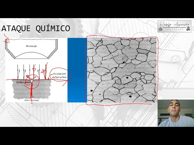 conseguir enxergar lá Quais são as fases como é que essas partes estão distribuídas né a forma né do dos grãos da do seu material da sua mostra Beleza então o ataque químico ele tem essa função tá de revelar Como é que tá a microestrutura das amostras dos corpos de prova do material pessoal vamos dar uma olhada aí na imagem do slide anterior para entender melhor como funciona o ataque bom então é o seguinte é para que a gente conseguir enxergar né mas é a seta do Gênesis no material é necessário que a luz do microscópio