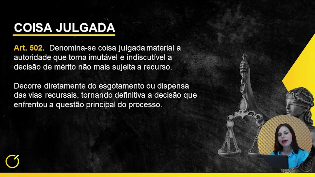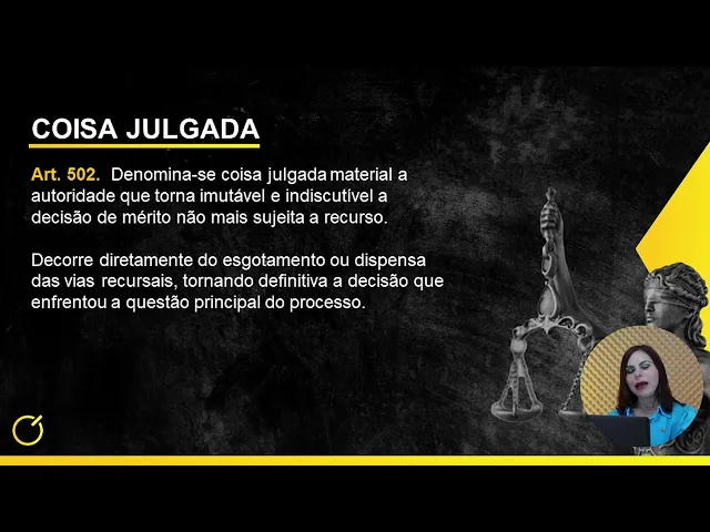 O artigo 502 do Código de Processo Civil fala da coisa julgada, que se denomina coisa julgada material: é a autoridade que torna imutável e indiscutível a decisão de mérito, que não mais sujeita a recurso. Então, esse é o conceito. Legal de coisa julgada, então, decorre diretamente do esgotamento ou dispensa das vias recursais.