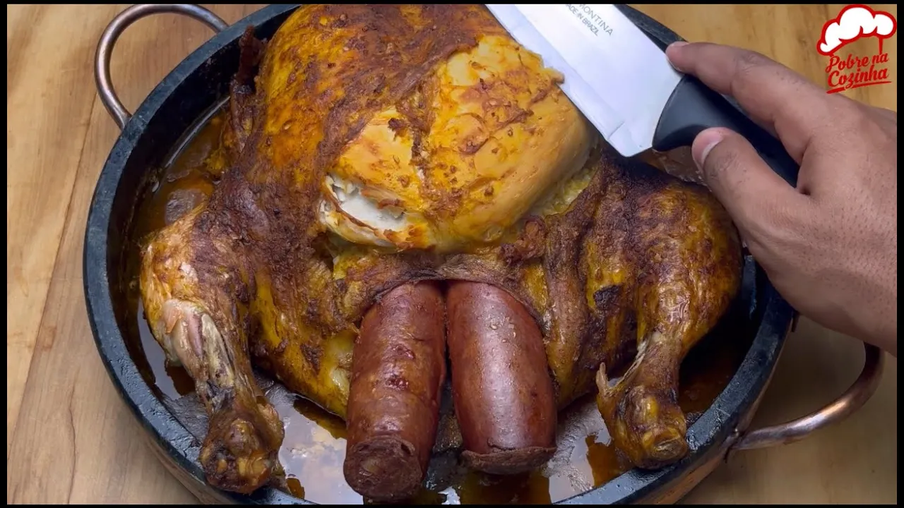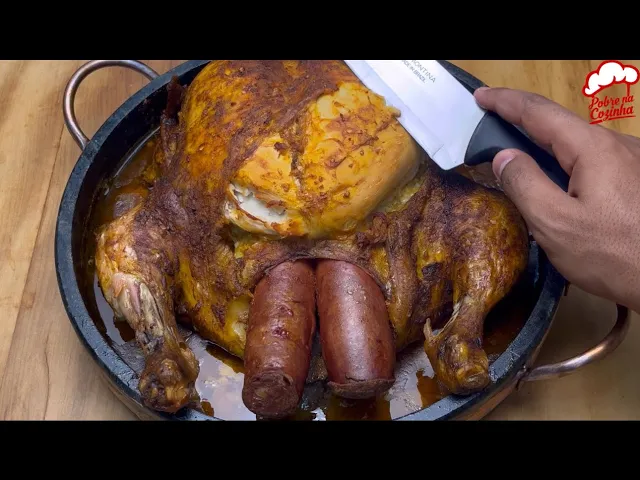 vai deixar o frango muito suculento e saboroso Pessoal esse truque agora vai deixar seu frango ainda mais saboroso adicionando duas calabresas na parte de dentro aonde que vai dar Ainda Mais Sabor nesse frango feito isso Pessoal agora é só a gente cobrir novamente com plástico filme e vamos deixar descansando por mais 12 horas no [Música] mínimo agora pessoal vamos cobrir esse frango com papel alumínio Lembrando que a parte brilhosa para baixo levar o forno por 1 hora e 30 minutos a 220º e sem papel alumínio para dourar por 200 g a 30 minutos e Olha